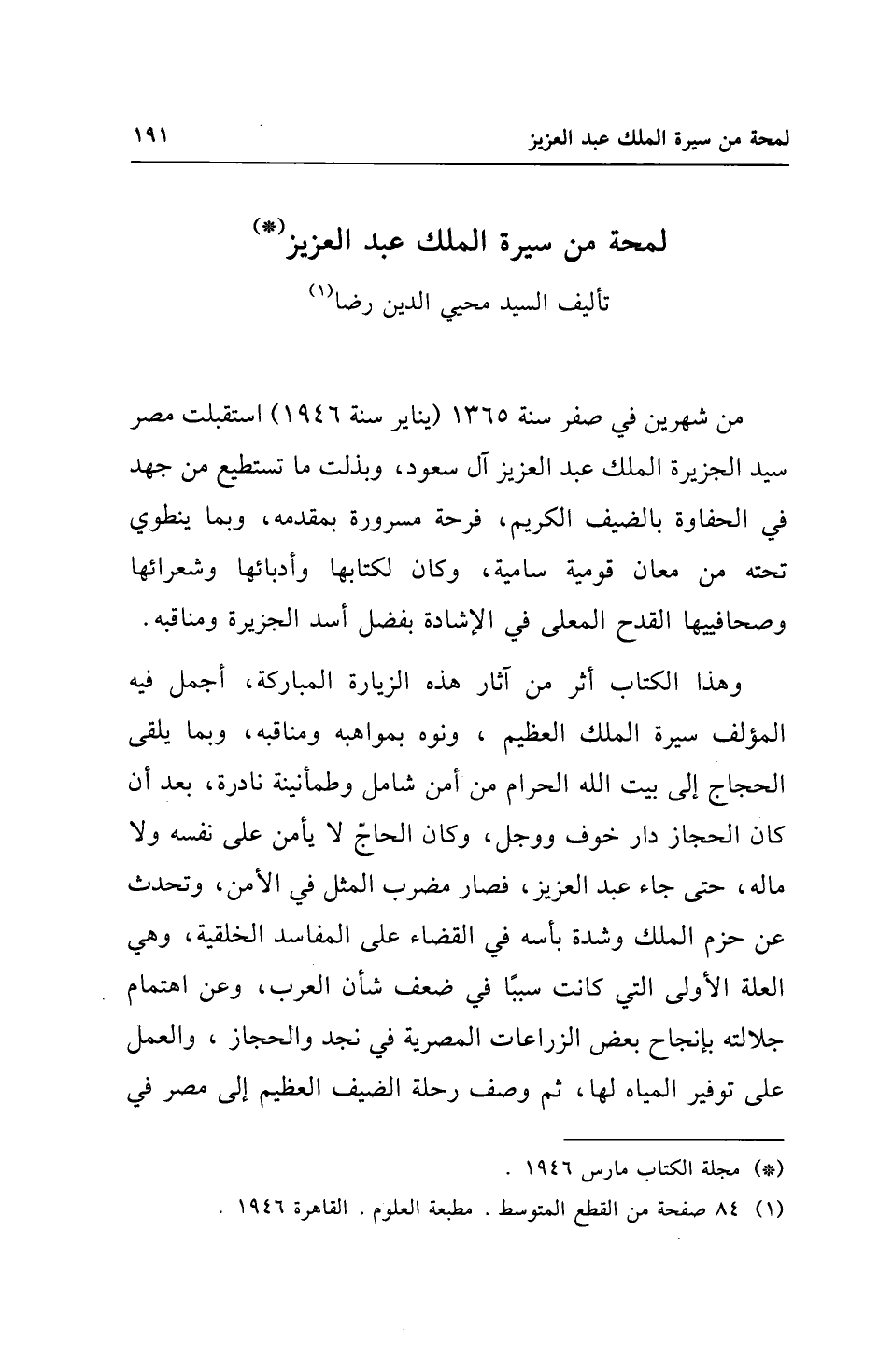 من شهرين في صفر سنة 1365 (يناير سنة 1946) استقبلت مصر سيد الجزيرة الملك عبد العزيز آل سعود، وبذلت ما تستطيع من جهد في الحفاوة بالضيف الكريم، فرحة مسرورة بمقدمه، وبما ينطوي تحته من معان قومية سامية، وكان لكتابها وأدبائها وشعرائها وصحافييها القدح المعلى في الإشادة بفضل أسد الجزيرة ومناقبه.