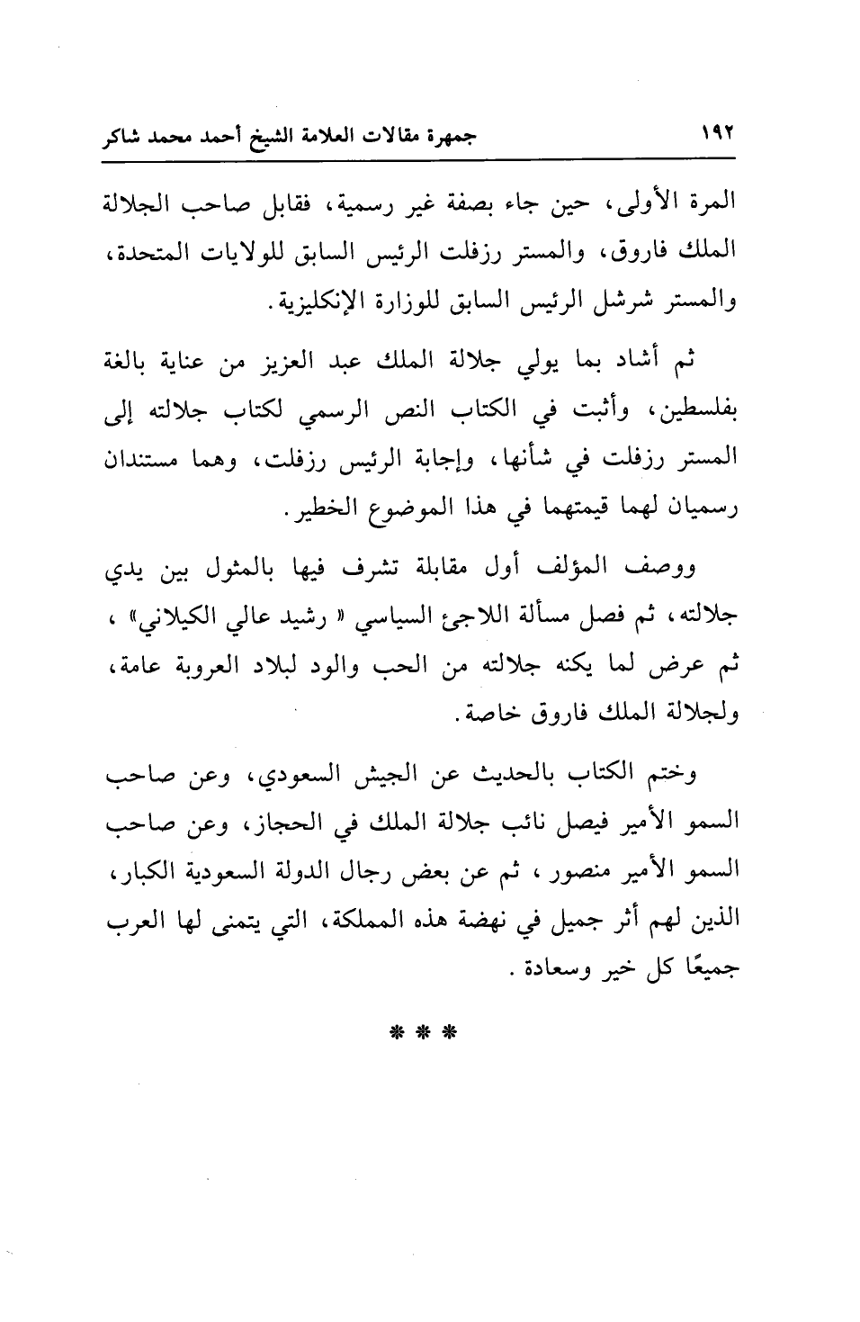 ثم أشاد بما يولي جلالة الملك عبد العزيز من عناية بالغة بفلسطين، وأثبت في الكتاب النص الرسمي لكتاب جلالته إلى المستر رزفلت في شأنها، وإجابة الرئيس رزفلت، وهما مستندان رسميان لهما قيمتهما في هذا الموضوع الخطير.