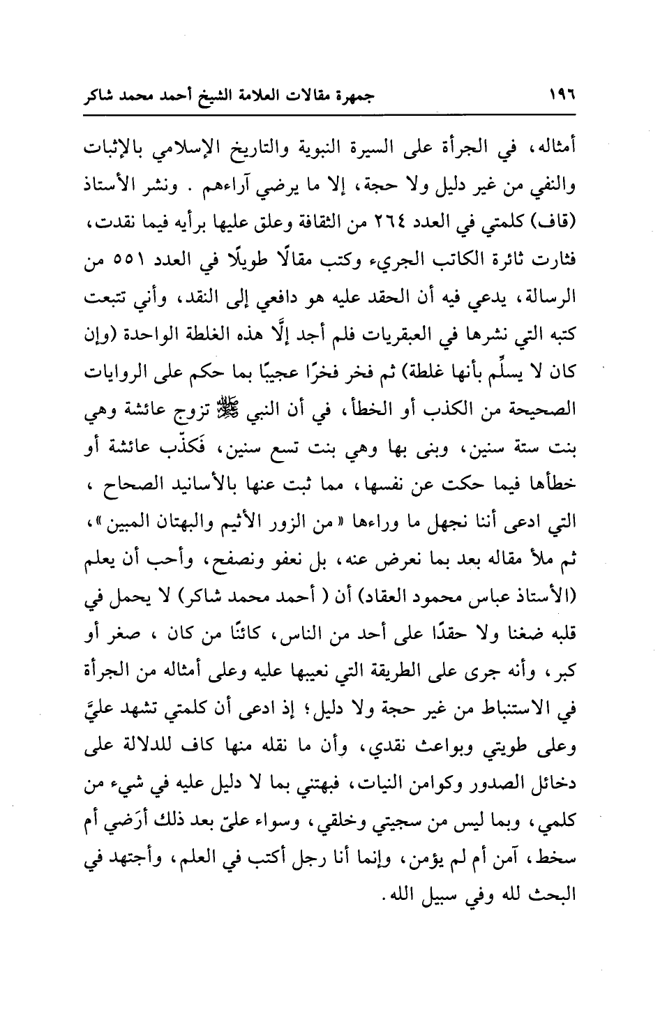 أمثاله، في الجرأة على السيرة النبوية والتاريخ الإسلامي بالإثبات والنفي من غير دليل ولا حجة، إلا ما يرضي آراءهم. ونشر الأستاذ (قاف) كلمتي في العدد 264 من الثقافة وعلق عليها برأيه فيما نقدت، فثارت ثائرة الكاتب الجريء وكتب مقالًا طويلًا في العدد 551 من الرسالة، يدعي فيه أن الحقد عليه هو دافعي إلى النقد، وأني تتبعت كتبه التي نشرها في العبقريات فلم أجد إلَّا هذه الغلطة الواحدة (وإن كان لا يسلِّم بأنها غلطة) ثم فخر فخرًا عجيبًا بما حكم على الروايات الصحيحة من الكذب أو الخطأ، في أن النبي - صلى الله عليه وسلم - تزوج عائشة وهي بنت ستة سنين، وبنى بها وهي بنت تسع سنين، فَكذّب عائشة أو خطأها فيما حكت عن نفسها، مما ثبت عنها بالأسانيد الصحاح، التي ادعى أننا نجهل ما وراءها "من الزور الأثيم والبهتان المبين"، ثم ملأ مقاله بعد بما نعرض عنه، بل نعفو ونصفح، وأحب أن يعلم (الأستاذ عباس محمود العقاد) أن (أحمد محمد شاكر) لا يحمل في قلبه ضغنا ولا حقدًا على أحد من الناس، كائنًا من كان، صغر أو كبر، وأنه جرى على الطريقة التي نعيبها عليه وعلى أمثاله من الجرأة في الاستنباط من غير حجة ولا دليل؛ إذ ادعى أن كلمتي تشهد عليَّ وعلى طويتي وبواعث نقدي، وأن ما نقله منها كاف للدلالة على دخائل الصدور وكوامن النيات، فبهتني بما لا دليل عليه في شيء من كلمي، وبما ليس من سجيتي وخلقي، وسواء عليَّ بعد ذلك أرَضي أم سخط، آمن أم لم يؤمن، وإنما أنا رجل أكتب في العلم، وأجتهد في البحث لله وفي سبيل الله.