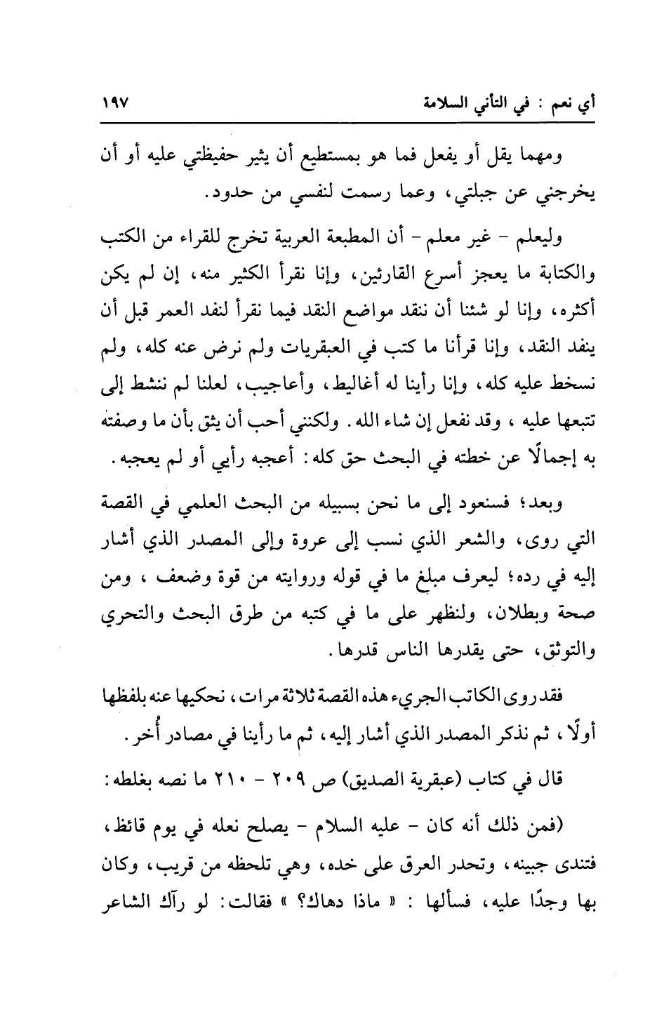 وبعد؛ فسنعود إلى ما نحن بسبيله من البحث العلمي في القصة التي روى، والشعر الذي نسب إلى عروة وإلى المصدر الذي أشار إليه في رده؛ ليعرف مبلغ ما في قوله وروايته من قوة وضعف، ومن صحة وبطلان، ولنظهر على ما في كتبه من طرق البحث والتحري والتوثق، حتى يقدرها الناس قدرها.