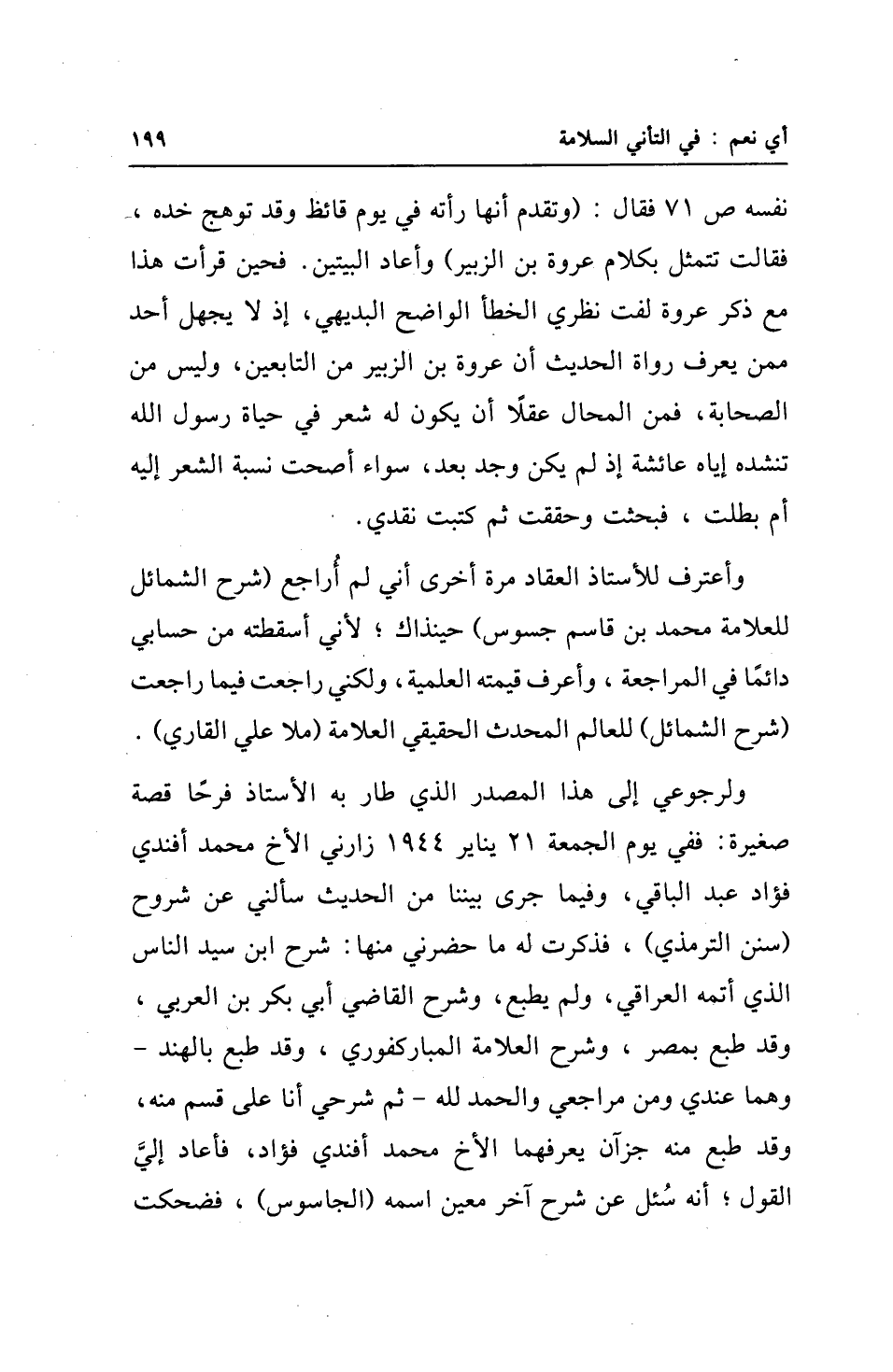 نفسه ص 71 فقال: (وتقدم أنها رأته في يوم قائظ وقد توهج خده، فقالت تتمثل بكلام عروة بن الزبير) وأعاد البيتين. فحين قرأت هذا مع ذكر عروة لفت نظري الخطأ الواضح البديهي، إذ لا يجهل أحد ممن يعرف رواة الحديث أن عروة بن الزبير من التابعين، وليس من الصحابة، فمن المحال عقلًا أن يكون له شعر في حياة رسول الله تنشده إياه عائشة إذ لم يكن وجد بعد، سواء أصحت نسبة الشعر إليه أم بطلت، فبحثت وحققت ثم كتبت نقدي.