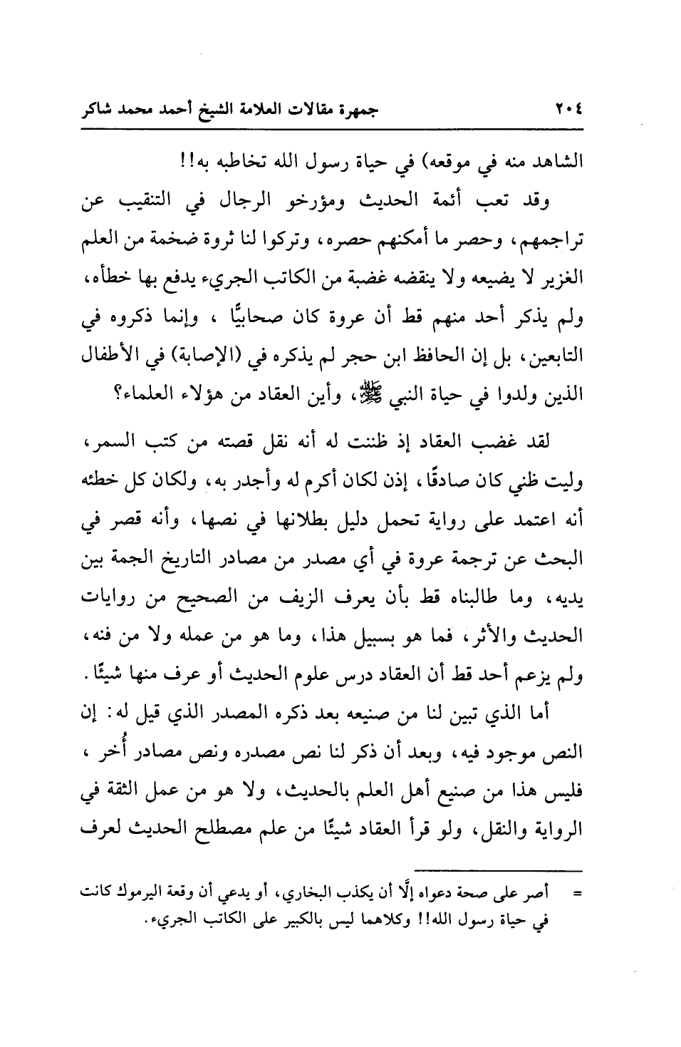 لقد غضب العقاد إذ ظننت له أنه نقل قصته من كتب السمر، وليت ظني كان صادقًا، إذن لكان أكرم له وأجدر به، ولكان كل خطئه أنه اعتمد على رواية تحمل دليل بطلانها في نصها، وأنه قصر في البحث عن ترجمة عروة في أي مصدر من مصادر التاريخ الجمة بين يديه، وما طالبناه قط بأن يعرف الزيف من الصحيح من روايات الحديث والأثر، فما هو بسبيل هذا، وما هو من عمله ولا من فنه، ولم يزعم أحد قط أن العقاد درس علوم الحديث أو عرف منها شيئًا.