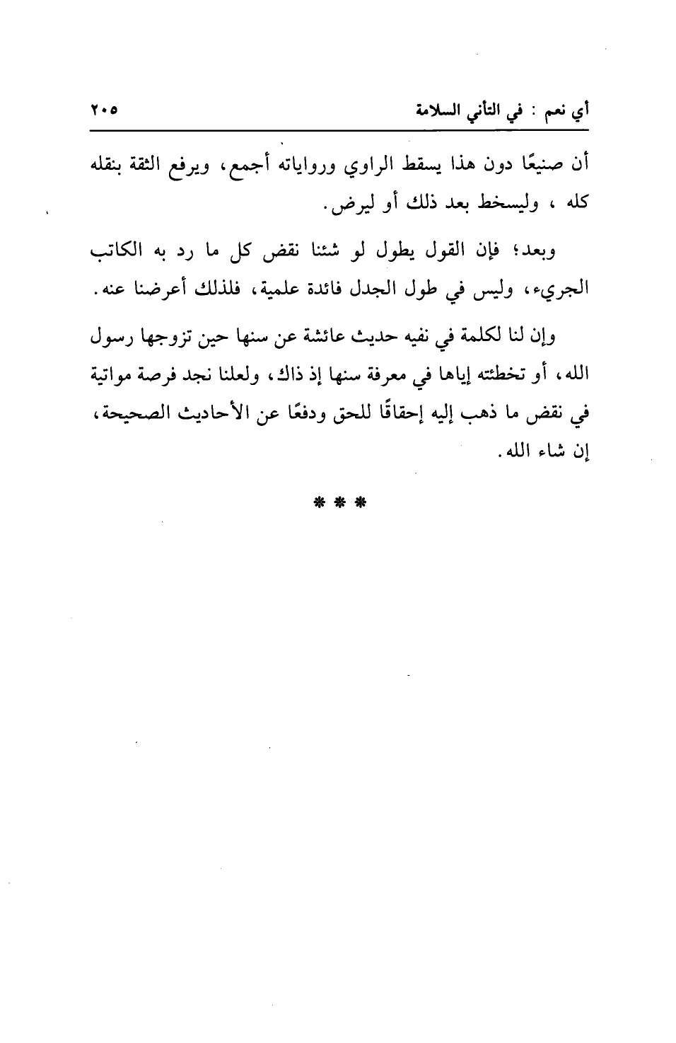 وإن لنا لكلمة في نفيه حديث عائشة عن سنها حين تزوجها رسول الله، أو تخطئته إياها في معرفة سنها إذ ذاك، ولعلنا نجد فرصة مواتية في نقض ما ذهب إليه إحقاقًا للحق ودفعًا عن الأحاديث الصحيحة, إن شاء الله.
