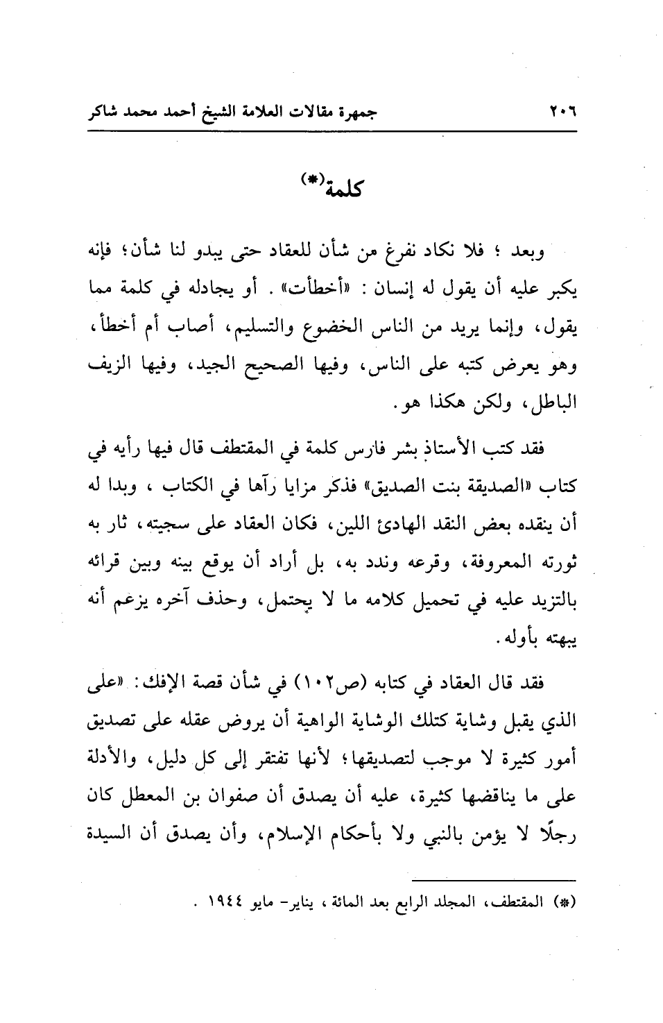 فقد كتب الأستاذ بشر فارس كلمة في المقتطف قال فيها رأيه في كتاب "الصديقة بنت الصديق" فذكر مزايا رآها في الكتاب، وبدا له أن ينقده بعض النقد الهادئ اللين، فكان العقاد على سجيته، ثار به ثورته المعروفة، وقرعه وندد به، بل أراد أن يوقع بينه وبين قرائه بالتزيد عليه في تحميل كلامه ما لا يحتمل، وحذف آخره يزعم أنه يبهته بأوله.