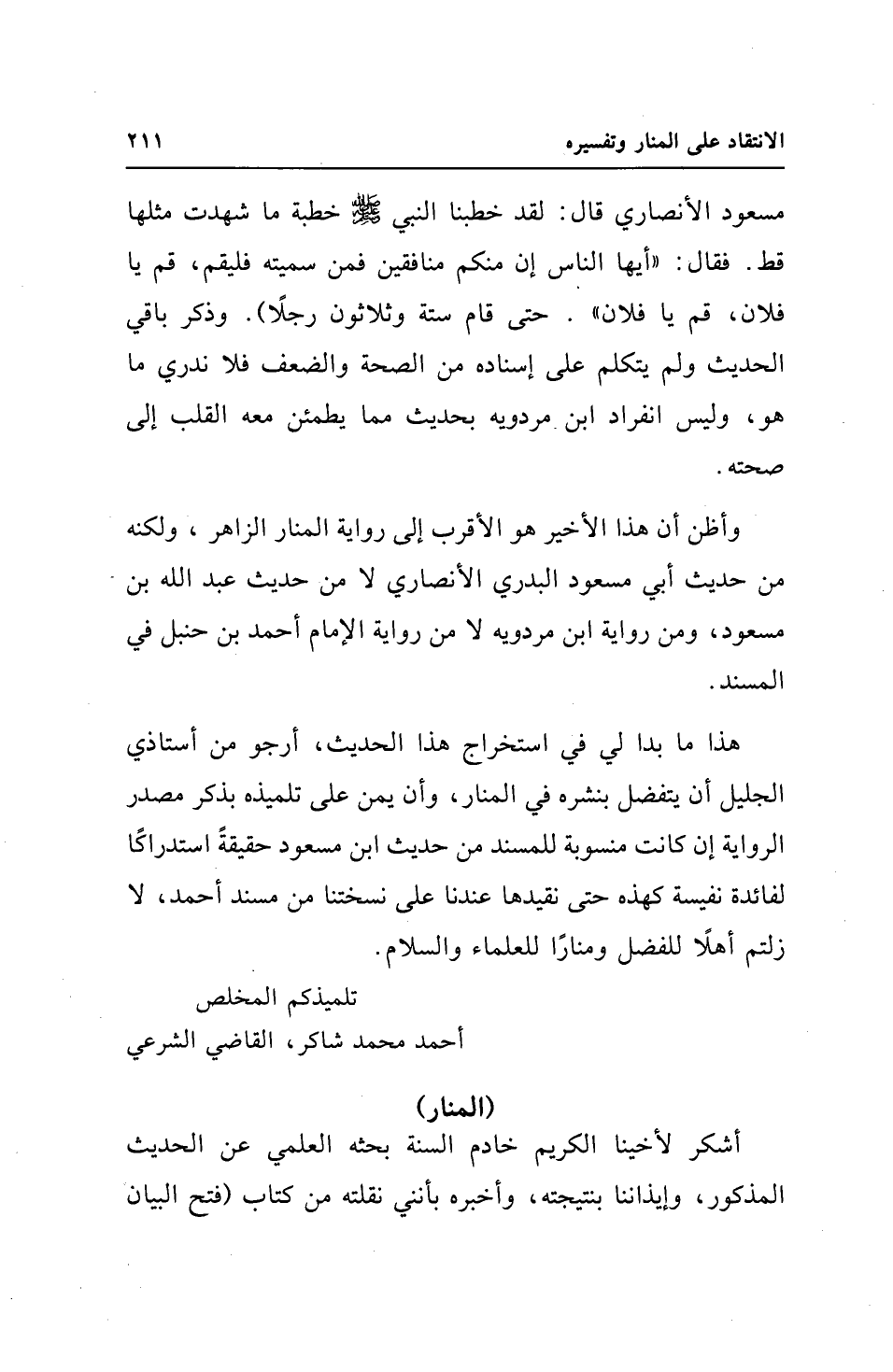 وأظن أن هذا الأخير هو الأقرب إلى رواية المنار الزاهر، ولكنه من حديث أبي مسعود البدري الأنصاري لا من حديث عبد الله بن مسعود، ومن رواية ابن مردويه لا من رواية الإِمام أحمد بن حنبل في المسند.