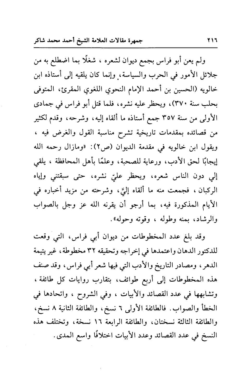 وقد بلغ عدد المخطوطات من ديوان أبي فراس، التي وقعت للدكتور الدهان واعتمدها في إخراجه وتحقيقه 32 مخطوطة، غير يتيمة الدهر، ومصادر التاريخ والأدب التي فيها شعر أبي فراس، وقد صنف هذه المخطوطات إلى أربع طوائف، بتقارب روايات كل طائفة، وتشابهها في عدد القصائد والأبيات، وفي الشروح، واتحادها في الخطأ والصواب. فالطائفة الأولى 6 نسخ، والطائفة الثانية 8 نسخ، والطائفة الثالثة نسختان، والطائفة الرابعة 16 نسخة، وتختلف هذه النسخ في عدد القصائد وعدد الأبيات اختلافًا واسع المدى.
