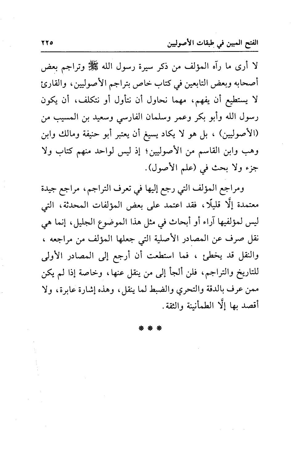 لا أرى ما رآه المؤلف من ذكر سيرة رسول الله - صلى الله عليه وسلم - وتراجم بعض أصحابه وبعض التابعين في كتاب خاص بتراجم الأصوليين، والقارئ لا يستطيع أن يفهم، مهما نحاول أن نتأول أو نتكلف، أن يكون رسول الله وأبو بكر وعمر وسلمان الفارسي وسعيد بن المسيب من (الأصوليين)، بل هو لا يكاد يسيغ أن يعتبر أبو حنيفة ومالك وابن وهب وابن القاسم من الأصوليين؛ إذ ليس لواحد منهم كتاب ولا جزء ولا بحث في (علم الأصول).