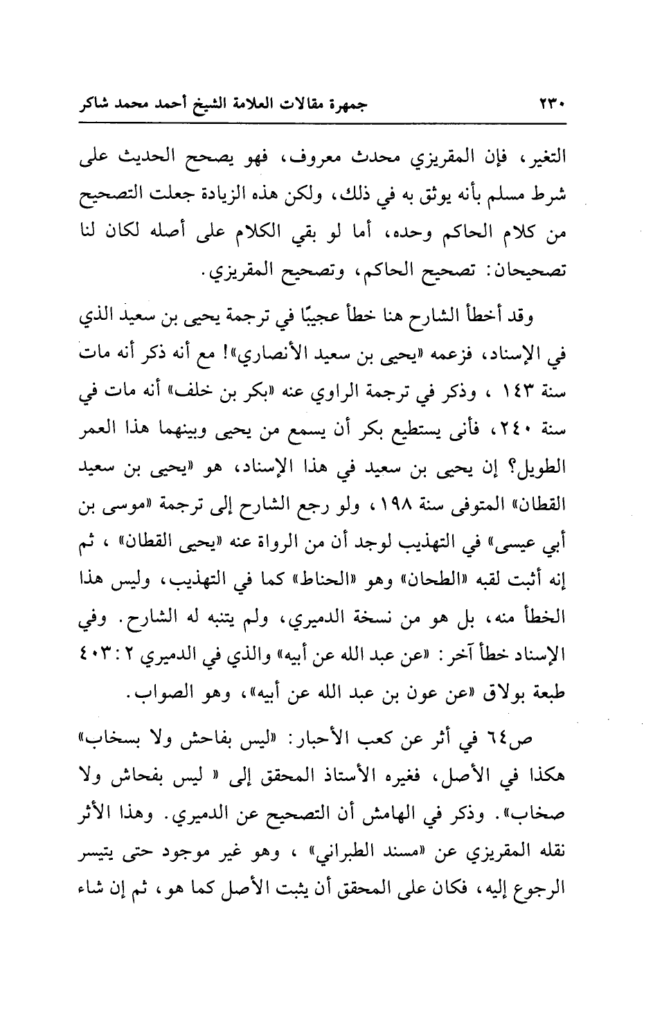 وقد أخطأ الشارح هنا خطأ عجيبًا في ترجمة يحيى بن سعيد الذي في الإسناد، فزعمه "يحيى بن سعيد الأنصاري"! مع أنه ذكر أنه مات سنة 143، وذكر في ترجمة الراوي عنه "بكر بن خلف" أنه مات في سنة 240، فأنى يستطيع بكر أن يسمع من يحيى وبينهما هذا العمر الطويل؟ إن يحيى بن سعيد في هذا الإسناد، هو "يحيى بن سعيد القطان" المتوفى سنة 198، ولو رجع الشارح إلى ترجمة "موسى بن أبي عيسى" في التهذيب لوجد أن من الرواة عنه "يحيى القطان"، ثم إنه أثبت لقبه "الطحان" وهو "الحفاظ" كما في التهذيب، وليس هذا الخطأ منه، بل هو من نسخة الدميري، ولم يتنبه له الشارح. وفي الإسناد خطأ آخر: "عن عبد الله عن أبيه" والذي في الدميري 2: 403 طبعة بولاق "عن عون بن عبد الله عن أبيه"، وهو الصواب.