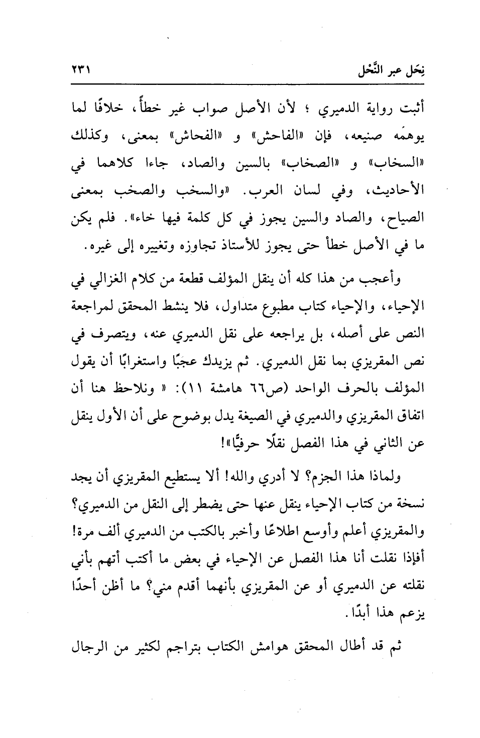 وأعجب من هذا كله أن ينقل المؤلف قطعة من كلام الغزالي في الإحياء، والإحياء كتاب مطبوع متداول، فلا ينشط المحقق لمراجعة النص على أصله، بل يراجعه على نقل الدميري عنه، ويتصرف في نص المقريزي بما نقل الدميري. ثم يزيدك عجبًا واستغرابًا أن يقول المؤلف بالحرف الواحد (ص 66 هامشة 11): "ونلاحظ هنا أن اتفاق المقريزي والدميري في الصيغة يدل بوضوح على أن الأول ينقل عن الثاني في هذا الفصل نقلًا حرفيًّا"!