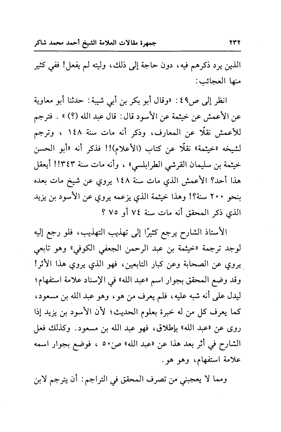 الأستاذ الشارح يرجع كثيرًا إلى تهذيب التهذيب، فلو رجع إليه لوجد ترجمة "خيثمة بن عبد الرحمن الجعفي الكوفي" وهو تابعي يروي عن الصحابة وعن كبار التابعين، فهو الذي يروي هذا الأثر! وقد وضع المحقق بجوار اسم "عبد الله" في الإسناد علامة استفهام؛ ليدل على أنه شبه عليه، فلم يعرف من هو، وهو عبد الله بن مسعود، كما يعرف كل من له خبرة بعلوم الحديث؛ لأن الأسود بن يزيد إذا روى عن "عبد الله" بإطلاق، فهو عبد الله بن مسعود. وكذلك فعل الشارح في أثر بعد هذا عن "عبد الله" ص 50، فوضع بجوار اسمه علامة استفهام، وهو هو.