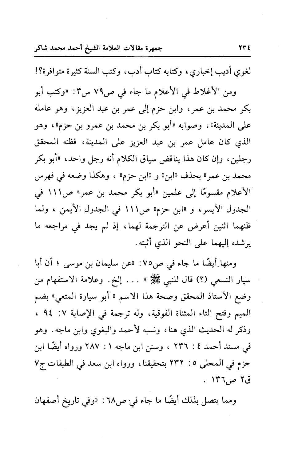 ومن الأغلاط في الأعلام ما جاء في ص 79 س 3: "وكتب أبو بكر محمَّد بن عمر، وابن حزم إلى عمر بن عبد العزيز، وهو عامله على المدينة"، وصوابه "أبو بكر بن محمَّد بن عمرو بن حزم"، وهو الذي كان عامل عمر بن عبد العزيز على المدينة، فظنه المحقق رجلين، وإن كان هذا يناقض سياق الكلام أنه رجل واحد، "أبو بكر محمَّد بن عمر" بحذف "ابن" و"ابن حزم"، وهكذا وضعه في فهرس الأعلام مقسومًا إلى علمين "أبو بكر محمَّد بن عمر" ص 111 في الجدول الأيسر، و"ابن حزم" ص 111 في الجدول الأيمن، ولما ظنهما اثنين أعرض عن الترجمة لهما، إذ لم يجد في مراجعه ما يرشده إليهما على النحو الذي أثبته.