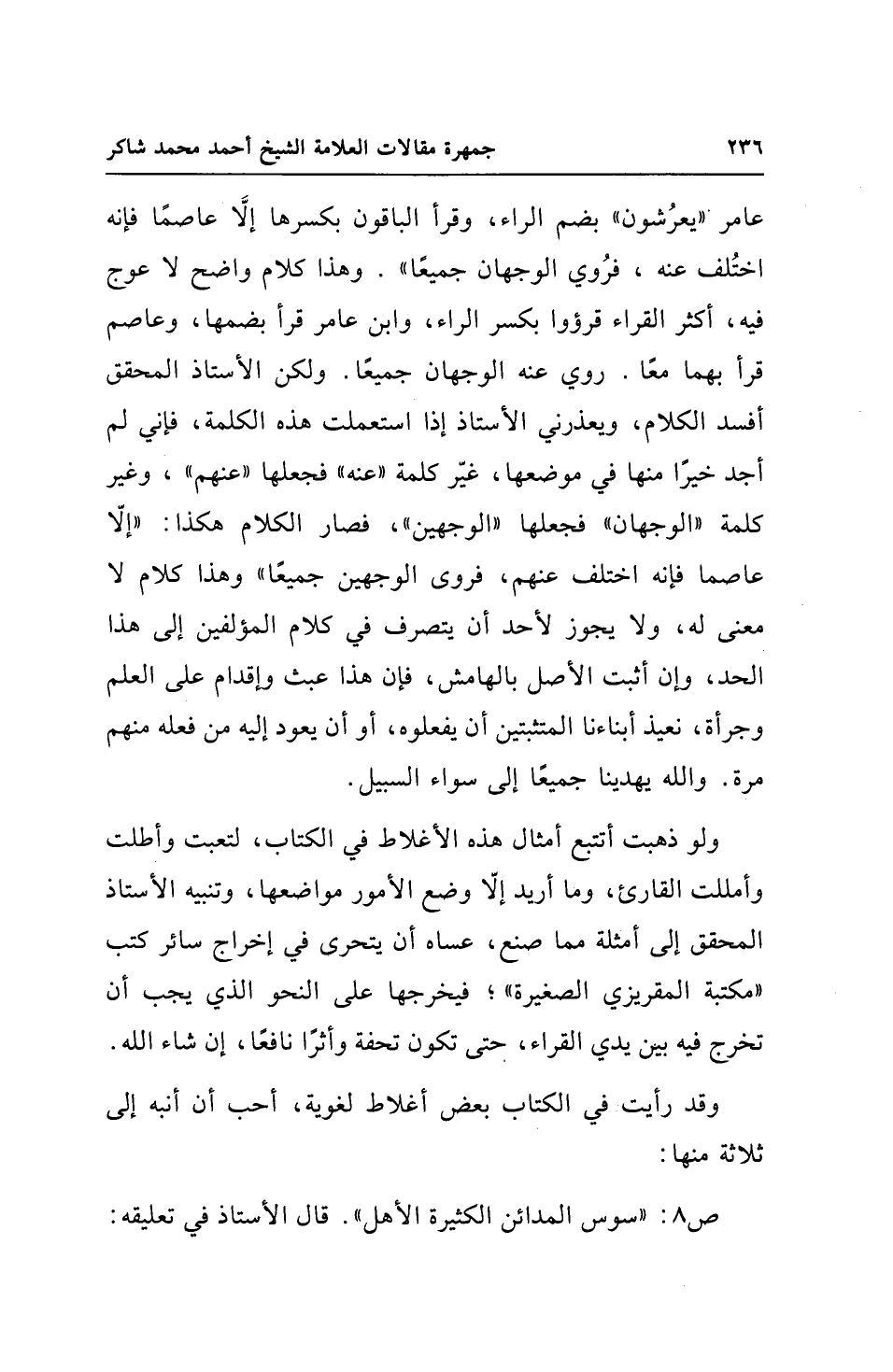 ولو ذهبت أتتبع أمثال هذه الأغلاط في الكتاب، لتعبت وأطلت وأمللت القارئ، وما أريد إلَّا وضع الأمور مواضعها، وتنبيه الأستاذ المحقق إلى أمثلة مما صنع، عساه أن يتحرى في إخراج سائر كتب "مكتبة المقريزي الصغيرة"؛ فيخرجها على النحو الذي يجب أن تخرج فيه بين يدي القراء، حتى تكون تحفة وأثرًا نافعًا، إن شاء الله.