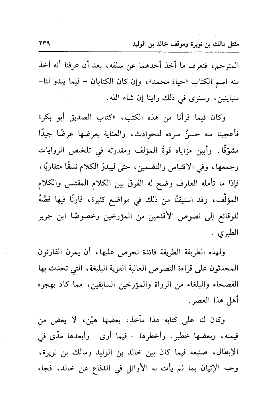 وكان لنا على كتابه هذا مآخذ، بعضها هيّن، لا يغض من قيمته، وبعضها خطير. وأخطرها - فيما أرى - وأبعدها مدًى في الإبطال، صنيعه فيما كان بين خالد بن الوليد ومالك بن نويرة، وحبه الإتيان بما لم يأت به الأوائل في الدفاع عن خالد، فجاء