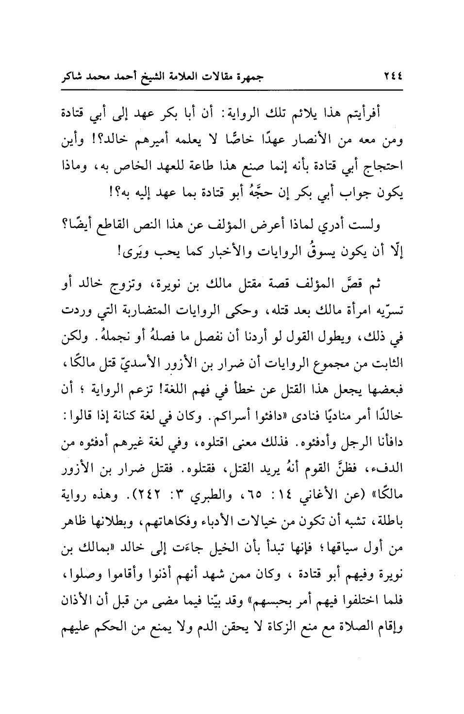 ثم قصَّ المؤلف قصة مقتل مالك بن نويرة، وتزوج خالد أو تسرّيه امرأة مالك بعد قتله، وحكى الروايات المتضاربة التي وردت في ذلك، ويطول القول لو أردنا أن نفصل ما فصلهُ أو نجملهُ. ولكن الثابت من مجموع الروايات أن ضرار بن الأزور الأسديّ قتل مالكًا، فبعضها يجعل هذا القتل عن خطأ في فهم اللغة! تزعم الرواية؛ أن خالدًا أمر مناديًا فنادى "دافئوا أسراكم. وكان في لغة كنانة إذا قالوا: دافأنا الرجل وأدفئوه. فذلك معنى اقتلوه، وفي لغة غيرهم أدفئوه من الدفء، فظنَّ القوم أنهُ يريد القتل، فقتلوه. فقتل ضرار بن الأزور مالكًا" (عن الأغاني 14: 65، والطبري 3: 242). وهذه رواية باطلة، تشبه أن تكون من خيالات الأدباء وفكاهاتهم، وبطلانها ظاهر من أول سياقها؛ فإنها تبدأ بأن الخيل جاءَت إلى خالد "بمالك بن نويرة وفيهم أبو قتادة، وكان ممن شهد أنهم أذنوا وأقاموا وصلوا، فلما اختلفوا فيهم أمر بحبسهم" وقد بيّنا فيما مضى من قبل أن الأذان وإقام الصلاة مع منع الزكاة لا يحقن الدم ولا يمنع من الحكم عليهم