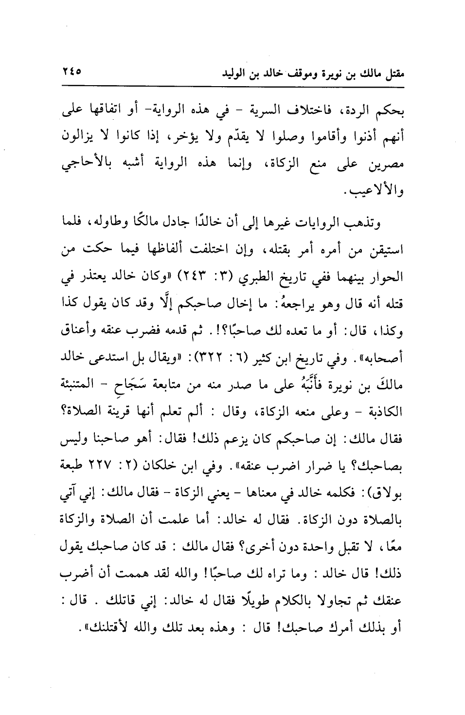وتذهب الروايات غيرها إلى أن خالدًا جادل مالكًا وطاوله، فلما استيقن من أمره أمر بقتله، وإن اختلفت ألفاظها فيما حكت من الحوار بينهما ففي تاريخ الطبري (3: 243) "وكان خالد يعتذر في قتله أنه قال وهو يراجعهُ: ما إخال صاحبكم إلَّا وقد كان يقول كذا وكذا، قال: أو ما تعده لك صاحبًا؟ ! . ثم قدمه فضرب عنقه وأعناق أصحابه". وفي تاريخ ابن كثير (6: 322): "ويقال بل استدعى خالد مالكَ بن نويرة فأَنَّبَهُ على ما صدر منه من متابعة سَجَاحِ - المتنبئة الكاذبة - وعلى منعه الزكاة، وقال: ألم تعلم أنها قرينة الصلاة؟ فقال مالك: إن صاحبكم كان يزعم ذلك! فقال: أهو صاحبنا وليس بصاحبك؟ يا ضرار اضرب عنقه". وفي ابن خلكان (2: 227 طبعة بولاق): فكلمه خالد في معناها - يعني الزكاة - فقال مالك: إني آتي بالصلاة دون الزكاة. فقال له خالد: أما علمت أن الصلاة والزكاة معًا، لا تقبل واحدة دون أخرى؟ فقال مالك: قد كان صاحبك يقول ذلك! قال خالد: وما تراه لك صاحبًا! والله لقد هممت أن أضرب عنقك ثم تجاولا بالكلام طويلًا فقال له خالد: إني قاتلك. قال: أو بذلك أمرك صاحبك! قال: وهذه بعد تلك والله لأقتلنك".