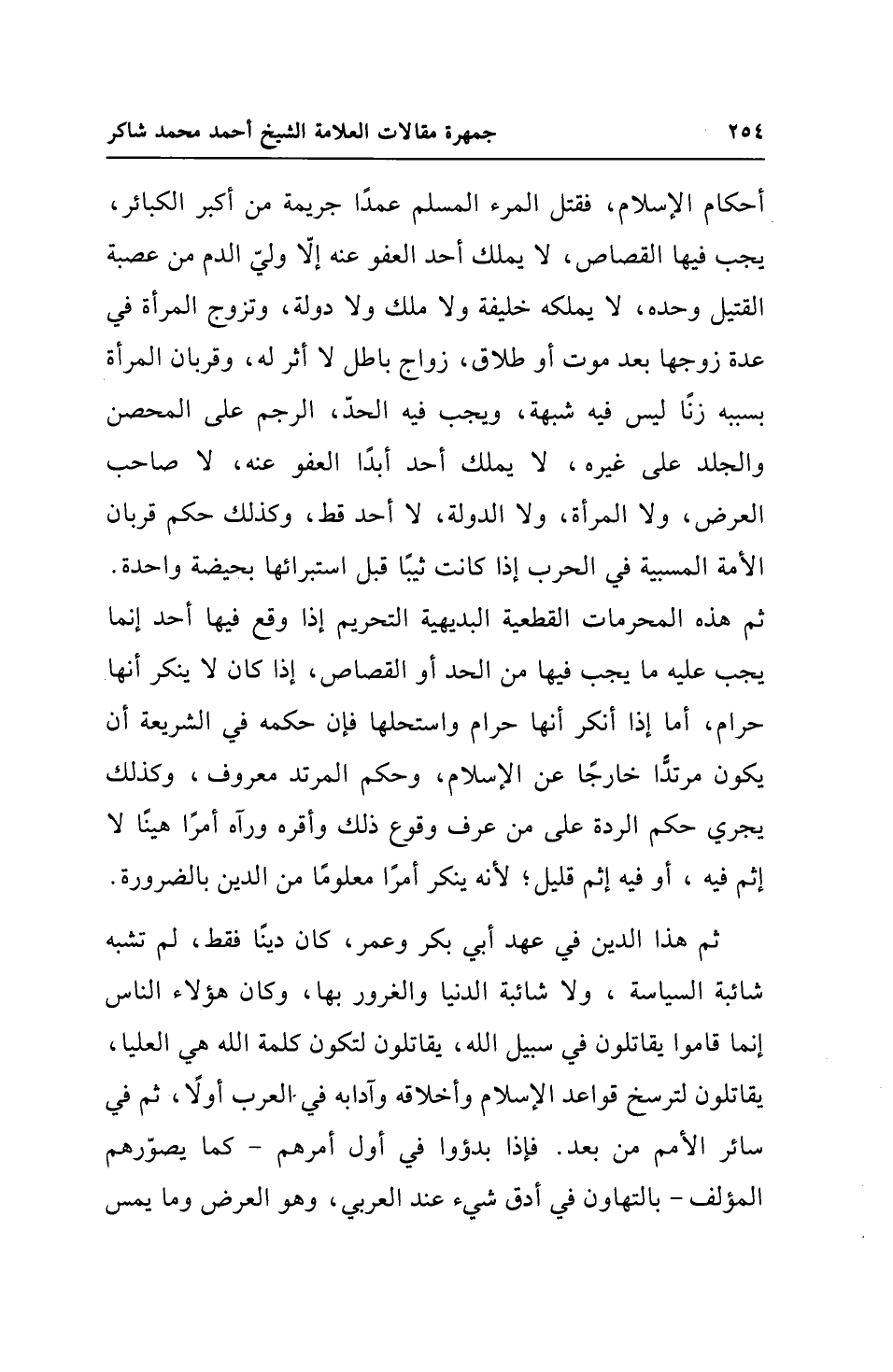 أحكام الإسلام، فقتل المرء المسلم عمدًا جريمة من أكبر الكبائر، يجب فيها القصاص، لا يملك أحد العفو عنه إلَّا وليّ الدم من عصبة القتيل وحده، لا يملكه خليفة ولا ملك ولا دولة، وتزوج المرأة في عدة زوجها بعد موت أو طلاق، زواج باطل لا أثر له، وقربان المرأة بسببه زنًا ليس فيه شبهة، ويجب فيه الحدّ، الرجم على المحصن والجلد على غيره، لا يملك أحد أبدًا العفو عنه، لا صاحب العرض، ولا المرأة، ولا الدولة، لا أحد قط، وكذلك حكم قربان الأمة المسبية في الحرب إذا كانت ثيبًا قبل استبرائها بحيضة واحدة. ثمَّ هذه المحرمات القطعية البديهية التحريم إذا وقع فيها أحد إنما يجب عليه ما يجب فيها من الحد أو القصاص، إذا كان لا ينكر أنها حرام، أما إذا أنكر أنها حرام واستحلها فإن حكمه في الشريعة أن يكون مرتدًّا خارجًا عن الإسلام، وحكم المرتد معروف، وكذلك يجري حكم الردة على من عرف وقوع ذلك وأقره ورآه أمرًا هينًا لا إثم فيه، أو فيه إثم قليل؛ لأنه ينكر أمرًا معلومًا من الدين بالضرورة.