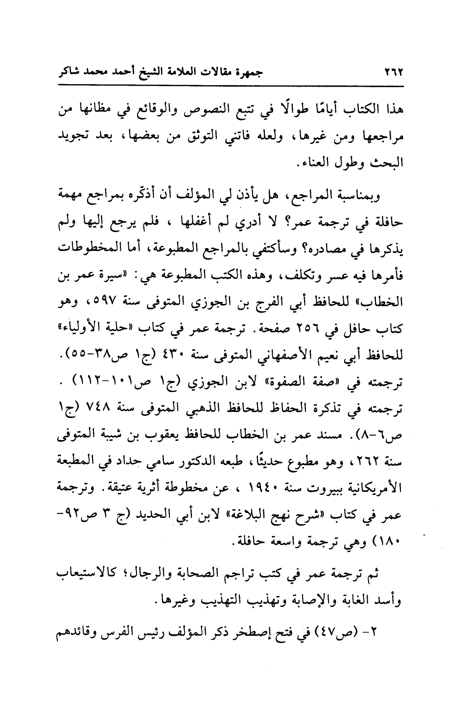 وبمناسبة المراجع، هل يأذن لي المؤلف أن أذكّره بمراجع مهمة حافلة في ترجمة عمر؟ لا أدري لم أغفلها، فلم يرجع إليها ولم يذكرها في مصادره؟ وسأكتفي بالمراجع المطبوعة، أما المخطوطات فأمرها فيه عسر وتكلف، وهذه الكتب المطبوعة هي: "سيرة عمر بن الخطاب" للحافظ أبي الفرج بن الجوزي المتوفى سنة 597، وهو كتاب حافل في 256 صفحة. ترجمة عمر في كتاب "حلية الأولياء" للحافظ أبي نعيم الأصفهاني المتوفى سنة 430 (ج 1 ص 38 - 55). ترجمته في "صفة الصفوة" لابن الجوزي (ج 1 ص 101 - 112). ترجمته في تذكرة الحفاظ للحافظ الذهبي المتوفى سنة 748 (ج 1 ص 6 - 8). مسند عمر بن الخطاب للحافظ يعقوب بن شيبة المتوفى سنة 262، وهو مطبوع حديثًا، طبعه الدكتور سامي حداد في المطبعة الأمريكانية ببيروت سنة 1940، عن مخطوطة أثرية عتيقة. وترجمة عمر في كتاب "شرح نهج البلاغة" لابن أبي الحديد (ج 3 ص 92 - 180) وهي ترجمة واسعة حافلة.