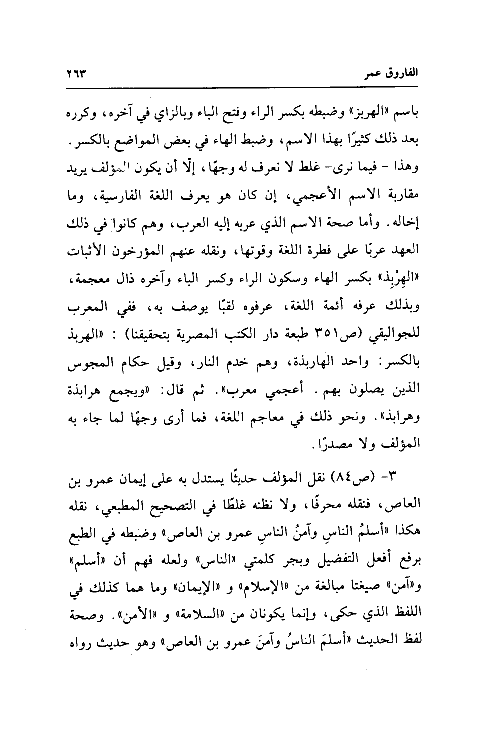 3 - (ص 84) نقل المؤلف حديثًا يستدل به على إيمان عمرو بن العاص، فنقله محرفًا، ولا نظنه غلطًا في التصحيح المطبعي، نقله هكذا "أسلمُ الناسِ وآمنُ الناسِ عمرو بن العاص" وضبطه في الطبع برفع أفعل التفضيل وبجر كلمتي "الناس" ولعله فهم أن "أسلم" و"آمن" صيغتا مبالغة من "الإسلام" و"الإيمان" وما هما كذلك في اللفظ الذي حكى، وإنما يكونان من "السلامة" و"الأمن". وصحة لفظ الحديث "أسلمَ الناسُ وآمنَ عمرو بن العاص" وهو حديث رواه