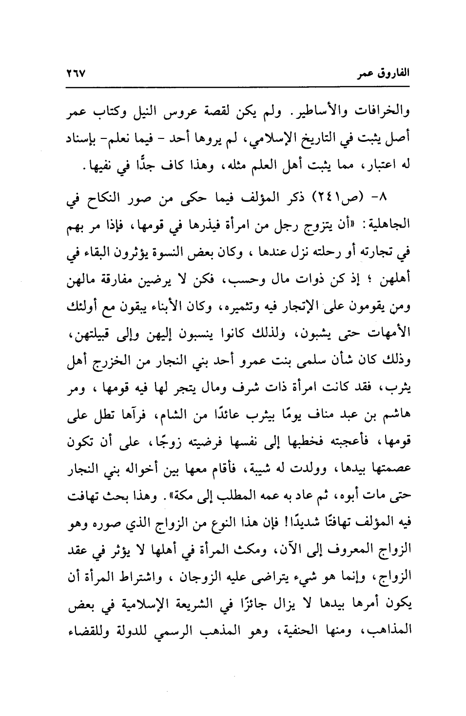 8 - (ص 241) ذكر المؤلف فيما حكى من صور النكاح في الجاهلية: "أن يتزوج رجل من امرأة فيذرها في قومها، فإذا مر بهم في تجارته أو رحلته نزل عندها، وكان بعض النسوة يؤثرون البقاء في أهلهن؛ إذ كن ذوات مال وحسب، فكن لا يرضين مفارقة مالهن ومن يقومون على الإتجار فيه وتثميره، وكان الأبناء يبقون مع أولئك الأمهات حتى يشبون، ولذلك كانوا ينسبون إليهن وإلى قبيلتهن، وذلك كان شأن سلمى بنت عمرو أحد بني النجار من الخزرج أهل يثرب، فقد كانت امرأة ذات شرف ومال يتجر لها فيه قومها، ومر هاشم بن عبد مناف يومًا بيثرب عائدًا من الشام، فرآها تطل على قومها، فأعجبته فخطبها إلى نفسها فرضيته زوجًا، على أن تكون عصمتها بيدها، وولدت له شيبة، فأقام معها بين أخواله بني النجار حتى مات أبوه، ثم عاد به عمه المطلب إلى مكة". وهذا بحث تهافت فيه المؤلف تهافتًا شديدًا! فإن هذا النوع من الزواج الذي صوره وهو الزواج المعروف إلى الآن، ومكث المرأة في أهلها لا يؤثر في عقد الزواج، وإنما هو شيء يتراضى عليه الزوجان، واشتراط المرأة أن يكون أمرها بيدها لا يزال جائزًا في الشريعة الإسلامية في بعض المذاهب، ومنها الحنفية، وهو المذهب الرسمي للدولة وللقضاء
