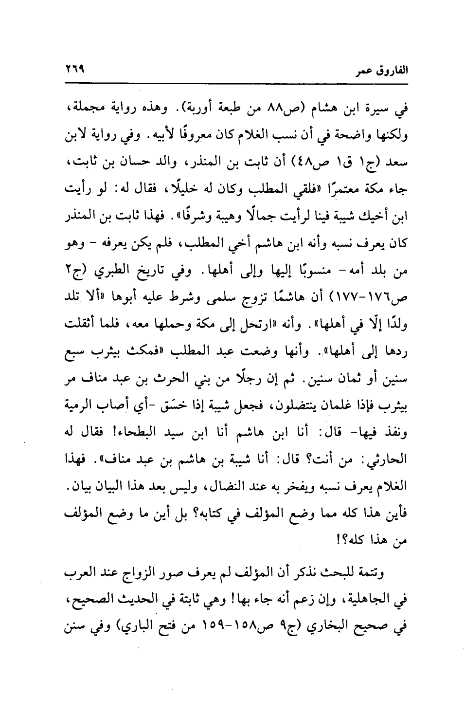 في سيرة ابن هشام (ص 88 من طبعة أوربة). وهذه رواية مجملة، ولكنها واضحة في أن نسب الغلام كان معروفًا لأبيه. وفي رواية لابن سعد (ج 1 ق 1 ص 48) أن ثابت بن المنذر، والد حسان بن ثابت، جاء مكة معتمرًا "فلقي المطلب وكان له خليلًا، فقال له: لو رأيت ابن أخيك شيبة فينا لرأيت جمالًا وهيبة وشرفًا". فهذا ثابت بن المنذر كان يعرف نسبه وأنه ابن هاشم أخي المطلب، فلم يكن يعرفه - وهو من بلد أمه - منسوبًا إليها وإلى أهلها. وفي تاريخ الطبري (ج 2 ص 176 - 177) أن هاشمًا تزوج سلمى وشرط عليه أبوها "ألا تلد ولدًا إلاّ في أهلها". وأنه "ارتحل إلى مكة وحملها معه، فلما أثقلت ردها إلى أهلها". وأنها وضعت عبد المطلب "فمكث بيثرب سبع سنين أو ثمان سنين. ثم إن رجلًا من بني الحرث بن عبد مناف مر بيثرب فإذا غلمان ينتضلون، فجعل شيبة إذا خسَق - أي أصاب الرمية ونفذ فيها - قال: أنا ابن هاشم أنا ابن سيد البطحاء! فقال له الحارثي: من أنت؟ قال: أنا شيبة بن هاشم بن عبد مناف". فهذا الغلام يعرف نسبه ويفخر به عند النضال، وليس بعد هذا البيان بيان. فأين هذا كله مما وضع المؤلف في كتابه؟ بل أين ما وضع المؤلف من هذا كله؟ !