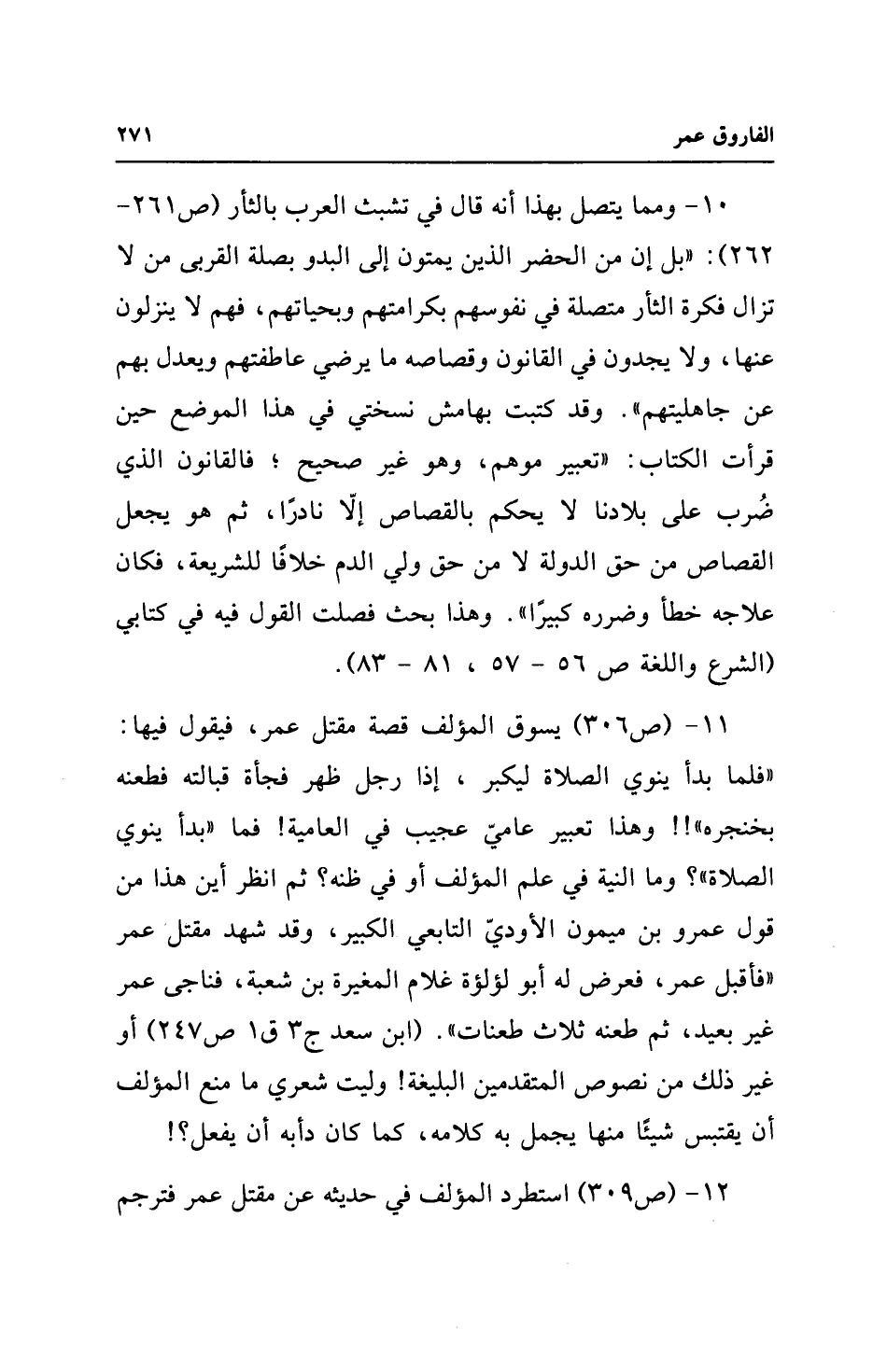 11 - (ص 306) يسوق المؤلف قصة مقتل عمر، فيقول فيها: "فلما بدأ ينوي الصلاة ليكبر، إذا رجل ظهر فجأة قبالته فطعنه بخنجره"! ! وهذا تعبير عاميّ عجيب في العامية! فما "بدأ ينوي الصلاة"؟ وما النية في علم المؤلف أو في ظنه؟ ثم انظر أين هذا من قول عمرو بن ميمون الأوديّ التابعي الكبير، وقد شهد مقتل عمر "فأقبل عمر، فعرض له أبو لؤلؤة غلام المغيرة بن شعبة، فناجى عمر غير بعيد، ثم طعنه ثلاث طعنات". (ابن سعد ج 3 ق 1 ص 247) أو غير ذلك من نصوص المتقدمين البليغة! وليت شعري ما منع المؤلف أن يقتبس شيئًا منها يجمل به كلامه، كما كان دأبه أن يفعل؟ !