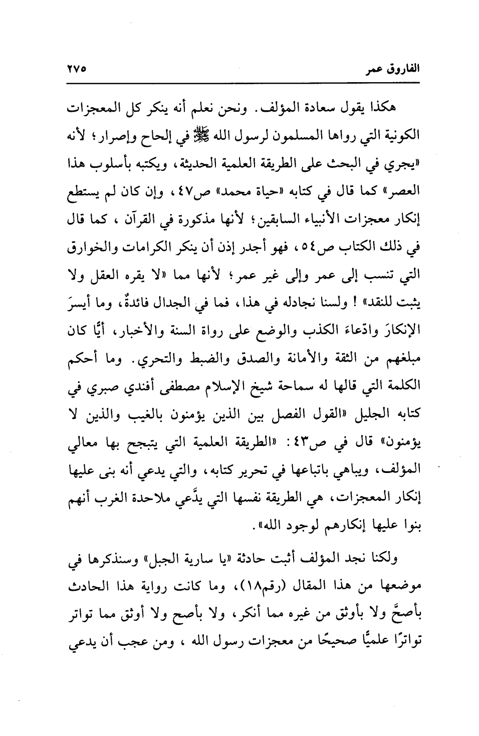هكذا يقول سعادة المؤلف. ونحن نعلم أنه ينكر كل المعجزات الكونية التي رواها المسلمون لرسول الله - صلى الله عليه وسلم - في إلحاح وإصرار؛ لأنه "يجري في البحث على الطريقة العلمية الحديثة، ويكتبه بأسلوب هذا العصر" كما قال في كتابه "حياة محمد" ص 47، وإن كان لم يستطع إنكار معجزات الأنبياء السابقين؛ لأنها مذكورة في القرآن، كما قال في ذلك الكتاب ص 54، فهو أجدر إذن أن ينكر الكرامات والخوارق التي تنسب إلى عمر وإلى غير عمر؛ لأنها مما "لا يقره العقل ولا يثبت للنقد"! ولسنا نجادله في هذا، فما في الجدال فائدةٌ، وما أيسرَ الإنكارَ وادّعاءَ الكذب والوضع على رواة السنة والأخبار، أيًّا كان مبلغهم من الثقة والأمانة والصدق والضبط والتحري. وما أحكم الكلمة التي قالها له سماحة شيخ الإسلام مصطفى أفندي صبري في كتابه الجليل "القول الفصل بين الذين يؤمنون بالغيب والذين لا يؤمنون" قال في ص 43: "الطريقة العلمية التي يتبجح بها معالي المؤلف، ويباهي باتباعها في تحرير كتابه، والتي يدعي أنه بني عليها إنكار المعجزات، هي الطريقة نفسها التي يدَّعي ملاحدة الغرب أنهم بنوا عليها إنكارهم لوجود الله".