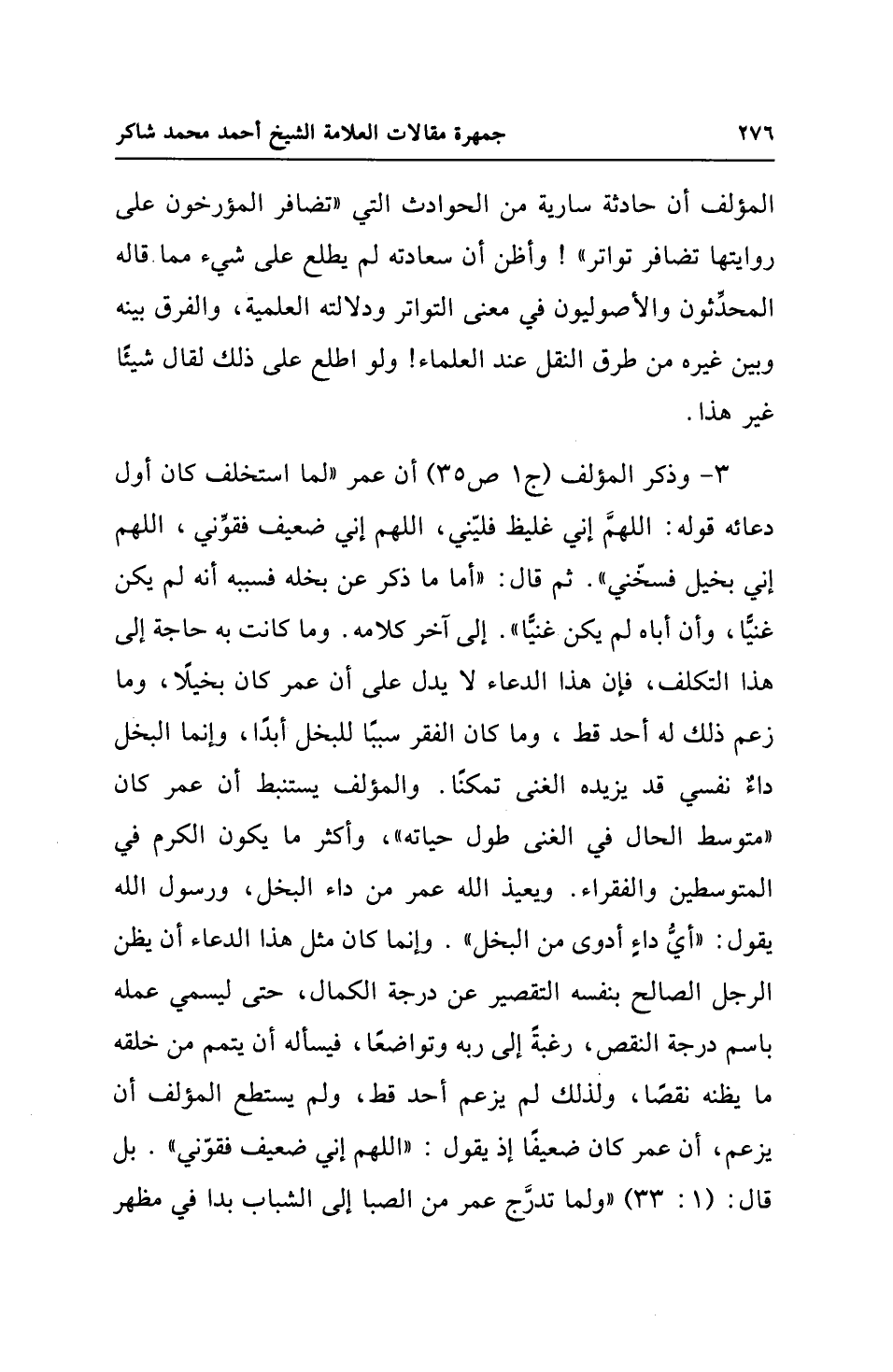 3 - وذكر المؤلف (ج 1 ص 35) أن عمر "لما استخلف كان أول دعائه قوله: اللهمَّ إني غليظ فليّني، اللهم إني ضعيف فقوِّني، اللهم إني بخيل فسخّني". ثم قال: "أما ما ذكر عن بخله فسببه أنه لم يكن غنيًّا، وأن أباه لم يكن غنيًّا". إلى آخر كلامه. وما كانت به حاجة إلى هذا التكلف، فإن هذا الدعاء لا يدل على أن عمر كان بخيلًا، وما زعم ذلك له أحد قط، وما كان الفقر سببًا للبخل أبدًا، وإنما البخل داءٌ نفسي قد يزيده الغنى تمكنًا. والمؤلف يستنبط أن عمر كان "متوسط الحال في الغنى طول حياته"، وأكثر ما يكون الكرم في المتوسطين والفقراء. ويعيذ الله عمر من داء البخل، ورسول الله يقول: "أيُّ داءٍ أدوى من البخل". وإنما كان مثل هذا الدعاء أن يظن الرجل الصالح بنفسه التقصير عن درجة الكمال، حتى ليسمي عمله باسم درجة النقص، رغبةً إلى ربه وتواضعًا، فيسأله أن يتمم من خلقه ما يظنه نقصًا، ولذلك لم يزعم أحد قط، ولم يستطع المؤلف أن يزعم، أن عمر كان ضعيفًا إذ يقول: "اللهم إني ضعيف فقوّني". بل قال: (1: 33) "ولما تدرَّج عمر من الصبا إلى الشباب بدا في مظهر
