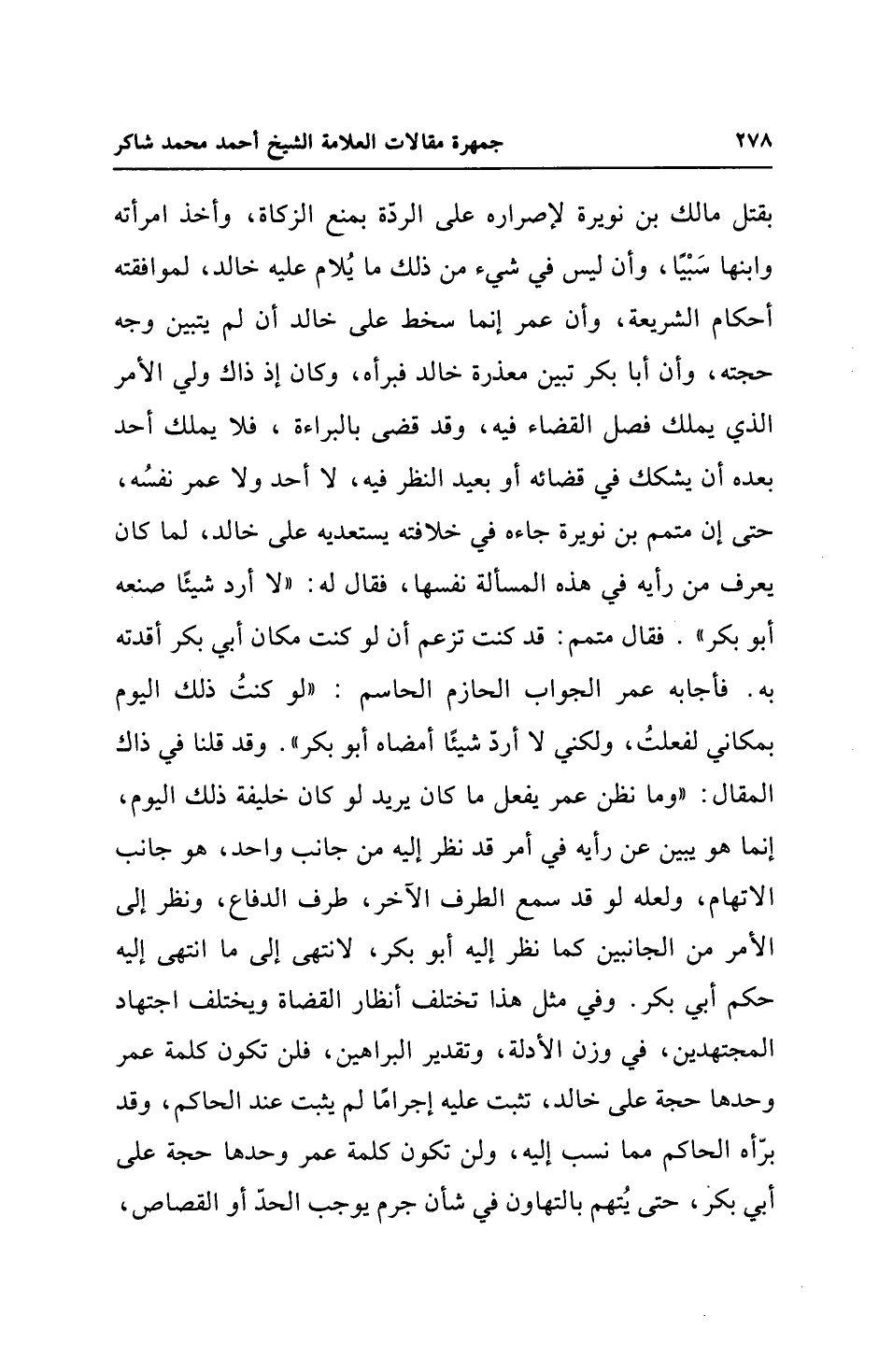 بقتل مالك بن نويرة لإصراره على الردّة بمنع الزكاة، وأخذ امرأته وابنها سَبْيًا، وأن ليس في شيء من ذلك ما يُلام عليه خالد، لموافقته أحكام الشريعة، وأن عمر إنما سخط على خالد أن لم يتبين وجه حجته، وأن أبا بكر تبين معذرة خالد فبرأه، وكان إذ ذاك ولي الأمر الذي يملك فصل القضاء فيه، وقد قضى بالبراءة، فلا يملك أحد بعده أن يشكك في قضائه أو بعيد النظر فيه، لا أحد ولا عمر نفسُه، حتى إن متمم بن نويرة جاءه في خلافته يستعديه على خالد، لما كان يعرف من رأيه في هذه المسألة نفسها، فقال له: "لا أرد شيئًا صنعه أبو بكر". فقال متمم: قد كنت تزعم أن لو كنت مكان أبي بكر أقدته به. فأجابه عمر الجواب الحازم الحاسم: "لو كنتُ ذلك اليوم بمكاني لفعلتُ، ولكني لا أردّ شيئًا أمضاه أبو بكر". وقد قلنا في ذاك المقال: "وما نظن عمر يفعل ما كان يريد لو كان خليفة ذلك اليوم، إنما هو يبين عن رأيه في أمر قد نظر إليه من جانب واحد، هو جانب الاتهام، ولعله لو قد سمع الطرف الآخر، طرف الدفاع، ونظر إلى الأمر من الجانبين كما نظر إليه أبو بكر، لانتهى إلى ما انتهى إليه حكم أبي بكر. وفي مثل هذا تختلف أنظار القضاة ويختلف اجتهاد المجتهدين، في وزن الأدلة، وتقدير البراهين، فلن تكون كلمة عمر وحدها حجة على خالد، تثبت عليه إجرامًا لم يثبت عند الحاكم، وقد برّأه الحاكم مما نسب إليه، ولن تكون كلمة عمر وحدها حجة على أبي بكر، حتى يُتهم بالتهاون في شأن جرم يوجب الحدّ أو القصاص،