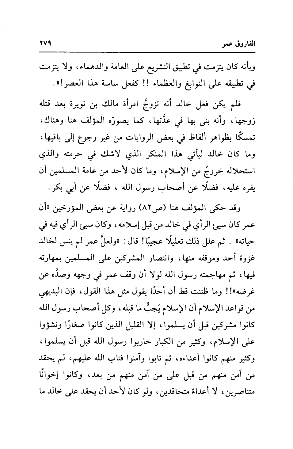 فلم يكن فعل خالد أنه تزوجَّ امرأة مالك بن نويرة بعد قتله زوجها، وأنه بني بها في عدَّتها، كما يصورّه المؤلف هنا وهناك، تمسكًا بظواهر ألفاظ في بعض الروايات من غير رجوع إلى باقيها، وما كان خالد ليأتي هذا المنكر الذي لا شك في حرمته والذي استحلاله خروجٌ من الإسلام، وما كان لأحد من عامة المسلمين أن يقره عليه، فضلًا عن أصحاب رسول الله، فضلًا عن أبي بكر.