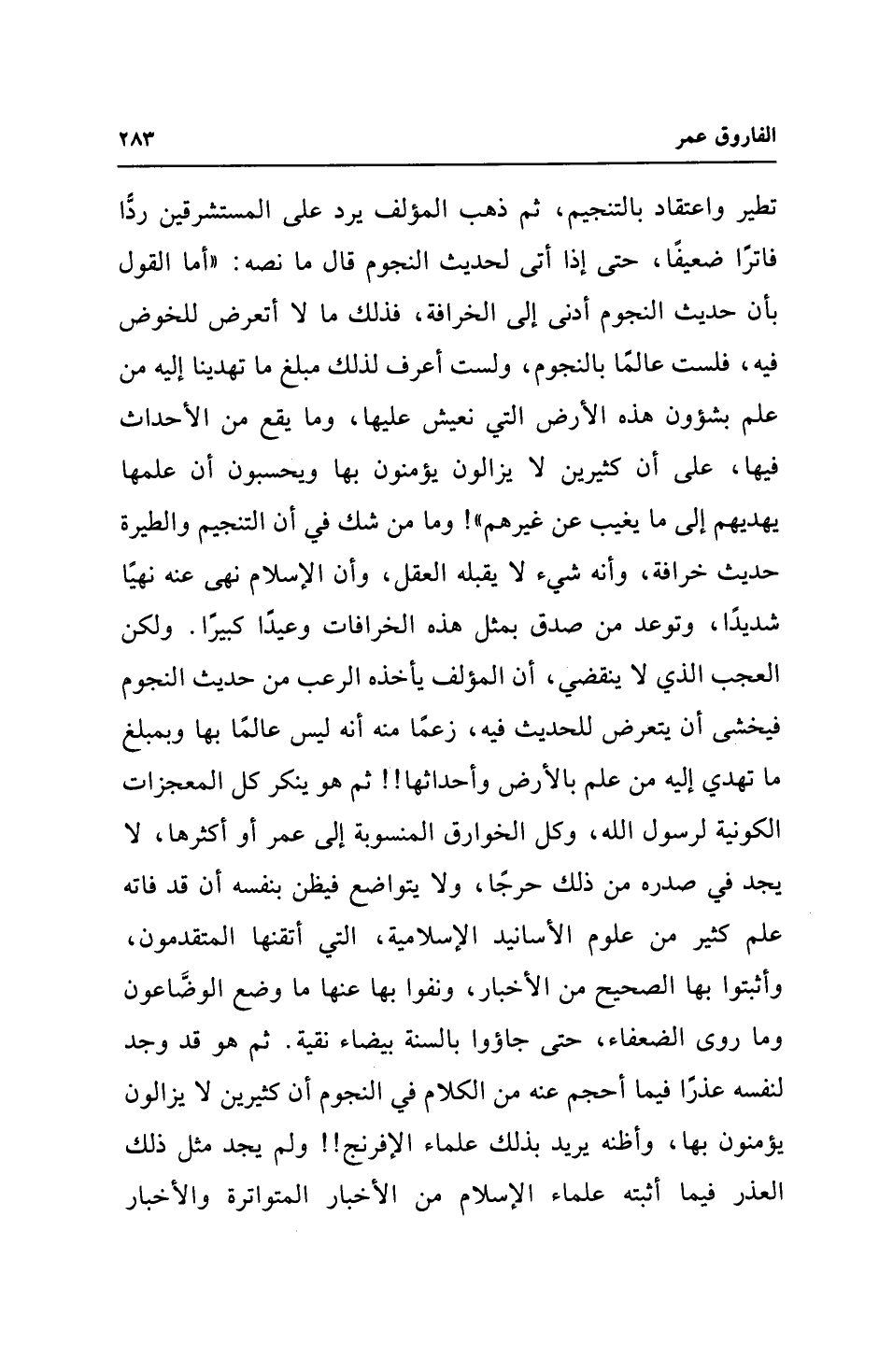 تطير واعتقاد بالتنجيم، ثم ذهب المؤلف يرد على المستشرقين ردًّا فاترًا ضعيفًا، حتى إذا أتى لحديث النجوم قال ما نصه: "أما القول بأن حديث النجوم أدنى إلى الخرافة، فذلك ما لا أتعرض للخوض فيه، فلست عالمًا بالنجوم، ولست أعرف لذلك مبلغ ما تهدينا إليه من علم بشؤون هذه الأرض التي نعيش عليها، وما يقع من الأحداث فيها، على أن كثيرين لا يزالون يؤمنون بها ويحسبون أن علمها يهديهم إلى ما يغيب عن غيرهم"! وما من شك في أن التنجيم والطيرة حديث خرافة، وأنه شيء لا يقبله العقل، وأن الإسلام نهى عنه نهيًا شديدًا، وتوعد من صدق بمثل هذه الخرافات وعيدًا كبيرًا. ولكن العجب الذي لا ينقضي، أن المؤلف يأخذه الرعب من حديث النجوم فيخشى أن يتعرض للحديث فيه، زعمًا منه أنه ليس عالمًا بها وبمبلغ ما تهدي إليه من علم بالأرض وأحداثها! ! ثم هو ينكر كل المعجزات الكونية لرسول الله، وكل الخوارق المنسوبة إلى عمر أو أكثرها، لا يجد في صدره من ذلك حرجًا، ولا يتواضع فيظن بنفسه أن قد فاته علم كثير من علوم الأسانيد الإسلامية، التي أتقنها المتقدمون، وأثبتوا بها الصحيح من الأخبار، ونفوا بها عنها ما وضع الوضَّاعون وما روى الضعفاء, حتى جاؤوا بالسنة بيضاء نقية. ثم هو قد وجد لنفسه عذرًا فيما أحجم عنه من الكلام في النجوم أن كثيرين لا يزالون يؤمنون بها، وأظنه يريد بذلك علماء الإفرنج! ! ولم يجد مثل ذلك العذر فيما أثبته علماء الإسلام من الأخبار المتواترة والأخبار