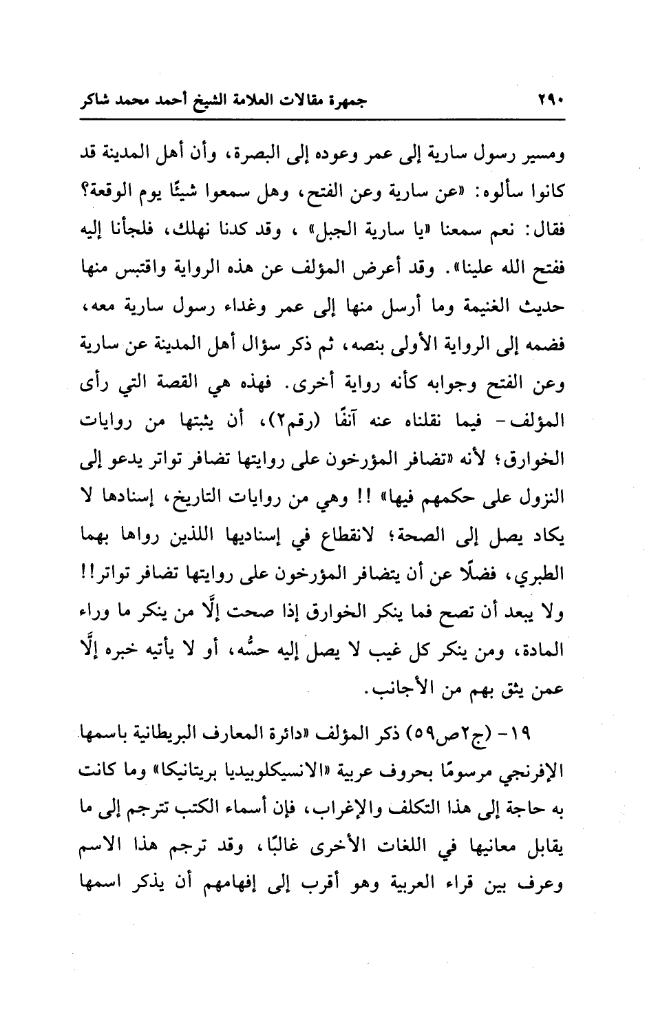 ومسير رسول سارية إلى عمر وعوده إلى البصرة، وأن أهل المدينة قد كانوا سألوه: "عن سارية وعن الفتح، وهل سمعوا شيئًا يوم الوقعة؟ فقال: نعم سمعنا "يا سارية الجبل"، وقد كدنا نهلك، فلجأنا إليه ففتح الله علينا". وقد أعرض المؤلف عن هذه الرواية واقتبس منها حديث الغنيمة وما أرسل منها إلى عمر وغداء رسول سارية معه، فضمه إلى الرواية الأولى بنصه، ثم ذكر سؤال أهل المدينة عن سارية وعن الفتح وجوابه كأنه رواية أخرى. فهذه هي القصة التي رأى المؤلف - فيما نقلناه عنه آنفًا (رقم 2)، أن يثبتها من روايات الخوارق؛ لأنه "تضافر المؤرخون على روايتها تضافر تواتر يدعو إلى النزول على حكمهم فيها"! ! وهي من روايات التاريخ، إسنادها لا يكاد يصل إلى الصحة؛ لانقطاع في إسناديها اللذين رواها بهما الطبري، فضلًا عن أن يتضافر المؤرخون على روايتها تضافر تواتر! ! ولا يبعد أن تصح فما ينكر الخوارق إذا صحت إلَّا من ينكر ما وراء المادة، ومن ينكر كل غيب لا يصل إليه حسُّه، أو لا يأتيه خبره إلَّا عمن يثق بهم من الأجانب.