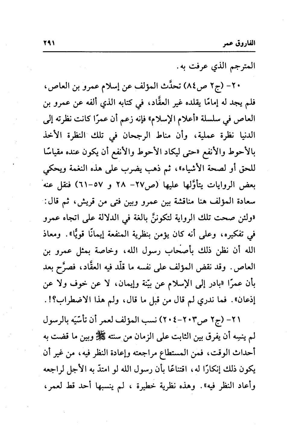 20 - (ج 2 ص 84) تحدَّث المؤلف عن إسلام عمرو بن العاص، فلم يجد له إمامًا يقلده غير العقَّاد، في كتابه الذي ألفه عن عمرو بن العاص في سلسلة "أعلام الإسلام" فإنه زعم أن عمرًا كانت نظرته إلى الدنيا نظرة عملية، وأن مناط الرجحان في تلك النظرة الأخذ بالأحوط والأنفع "حتى ليكاد الأحوط والأنفع أن يكون عنده مقياسًا للحق أو لصحة الأشياء"، ثم ذهب يضرب على هذه النغمة ويحكي بعض الروايات يتأوَّلها عليها (ص 27 - 28 و 57 - 61) فنقل عنه سعادة المؤلف هنا مناقشة بين عمرو وبين فتى من قريش، ثم قال: "ولئن صحت تلك الرواية لتكوننَّ بالغة في الدلالة على اتجاه عمرو في تفكيره، وعلى أنه كان يؤمن بنظرية المنفعة إيمانًا قويًّا". ومعاذ الله أن نظن ذلك بأصحاب رسول الله، وخاصة بمثل عمرو بن العاص. وقد نقض المؤلف على نفسه ما قلّد فيه العقّاد، فصرَّح بعد بأن عمرًا "بادر إلى الإسلام عن بيّنة وإيمان، لا عن خوف ولا عن إذعان". فما ندري لم قال من قبل ما قال، ولم هذا الاضطراب؟ ! .