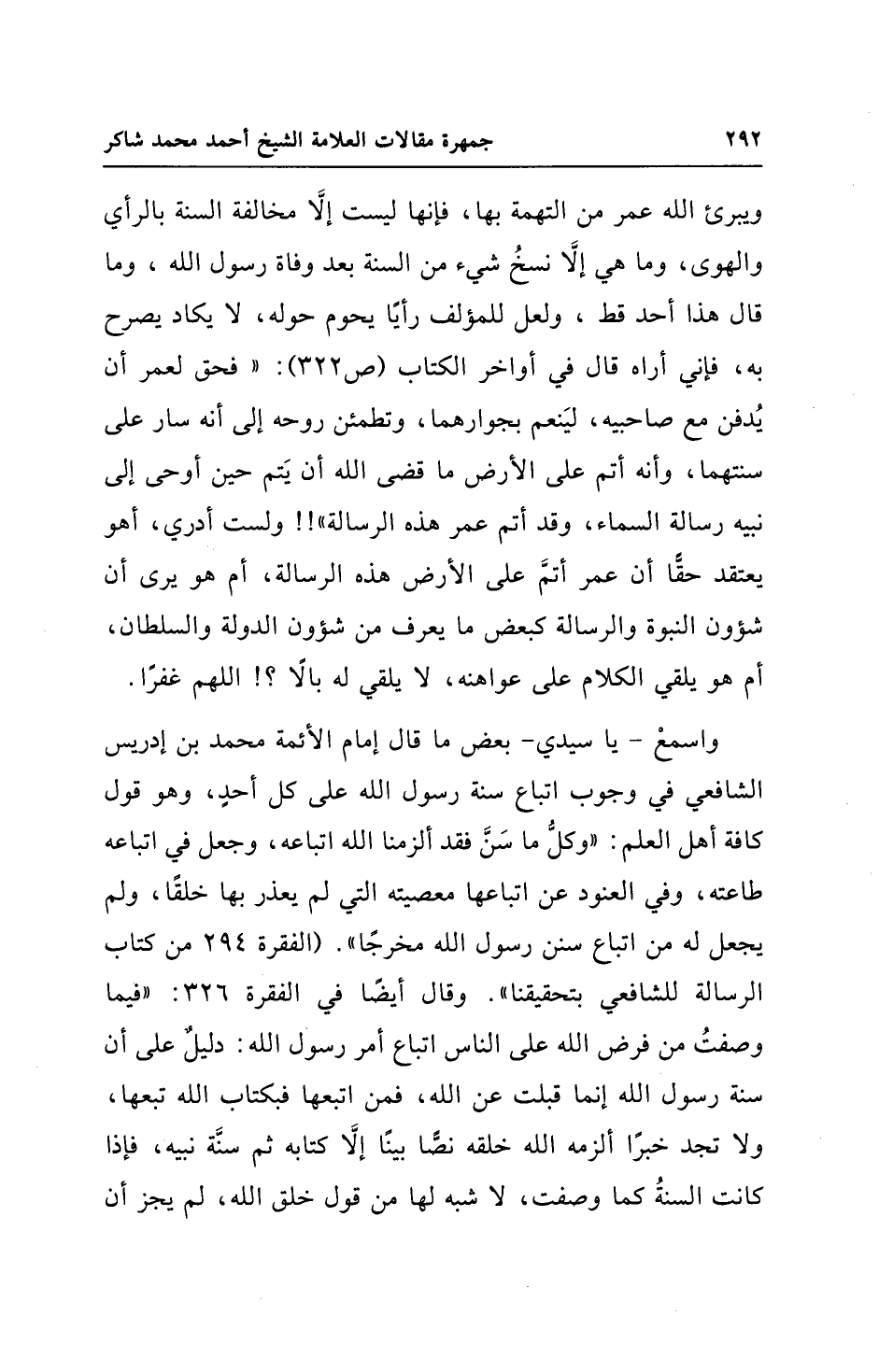 ويبرئ الله عمر من التهمة بها، فإنها ليست إلَّا مخالفة السنة بالرأي والهوى، وما هي إلَّا نسخُ شيء من السنة بعد وفاة رسول الله، وما قال هذا أحد قط، ولعل للمؤلف رأيًا يحوم حوله، لا يكاد يصرح به، فإني أراه قال في أواخر الكتاب (ص 322): "فحق لعمر أن يُدفن مع صاحبيه، ليَنعم بجوارهما، وتطمئن روحه إلى أنه سار على سنتهما، وأنه أتم على الأرض ما قضى الله أن يَتم حين أوحى إلى نبيه رسالة السماء، وقد أتم عمر هذه الرسالة"! ! ولست أدري، أهو يعتقد حقًّا أن عمر أتمَّ على الأرض هذه الرسالة، أم هو يرى أن شؤون النبوة والرسالة كبعض ما يعرف من شؤون الدولة والسلطان، أم هو يلقي الكلام على عواهنه، لا يلقي له بالًا؟ ! اللهم غفرًا.
