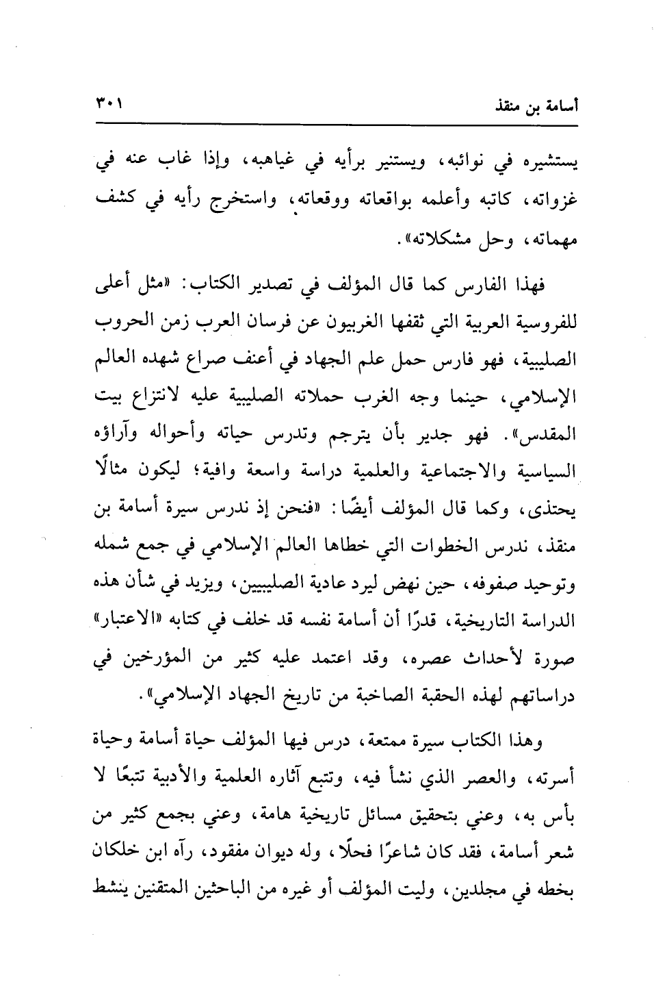 وهذا الكتاب سيرة ممتعة، درس فيها المؤلف حياة أسامة وحياة أسرته، والعصر الذي نشأ فيه، وتتبع آثاره العلمية والأدبية تتبعًا لا بأس به، وعني بتحقيق مسائل تاريخية هامة، وعني بجمع كثير من شعر أسامة، فقد كان شاعرًا فحلًا، وله ديوان مفقود، رآه ابن خلكان بخطه في مجلدين، وليت المؤلف أو غيره من الباحثين المتقنين ينشط