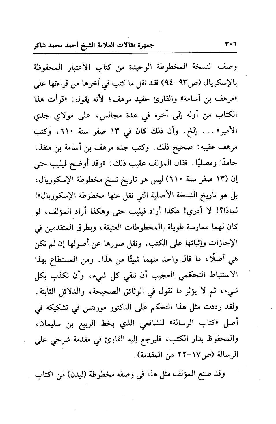 وصف النسخة المخطوطة الوحيدة من كتاب الاعتبار المحفوظة بالإسكريال (ص 93 - 94) فقد نقل ما كتب في آخرها من قراءتها على "مرهف بن أسامة" والقارئ حفيد مرهف؛ لأنه يقول: "قرأت هذا الكتاب من أوله إلى آخره في عدة مجالس، على مولاي جدي الأمير" ... إلخ. وأن ذلك كان في 13 صفر سنة 610، وكتب مرهف عقيبه: صحيح ذلك. وكتب جده مرهف بن أسامة بن منقذ، حامدًا ومصليًا. فقال المؤلف عقيب ذلك: "وقد أوضح فيليب حتى إن (13 صفر سنة 610) ليس هو تاريخ نسخ مخطوطة الإسكوريال، بل هو تاريخ النسخة الأصلية التي نقل عنها مخطوطة الإسكوريال"! لماذا؟ ! لا أدري! هكذا أراد فيليب حتى وهكذا أراد المؤلف، لو كان لهما ممارسة طويلة بالمخطوطات العتيقة، وبطرق المتقدمين في الإجازات وإثباتها على الكتب، ونقل صورها عن أصولها إن لم تكن هي أصلًا، ما قال واحد منهما شيئًا من هذا. ومن المستطاع بهذا الاستنباط التحكمي العجيب أن ننفي كل شيء، وأن نكذب بكل شيء، ثم لا يؤثر ما نقول في الوثائق الصحيحة، والدلائل الثابتة. ولقد رددت مثل هذا التحكم على الدكتور موريتس في تشكيكه في أصل "كتاب الرسالة" للشافعي الذي بخط الربيع بن سليمان، والمحفوظ بدار الكتب، فليرجع إليه القارئ في مقدمة شرحي على الرسالة (ص 17 - 22 من المقدمة).