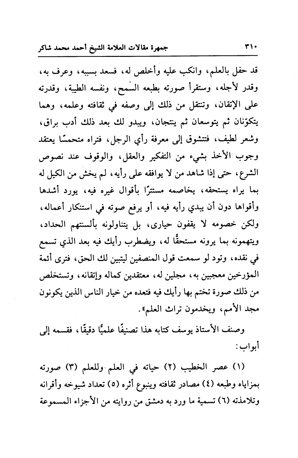 قد حفل بالعلم، وانكب عليه وأخلص له، فسعد بسببه، وعرف به، وقدر لأجله، وستقرأ صورته بطبعه السمح، ونفسه الطيبة، وقدرته على الإتقان، وتنتقل من ذلك إلى وصفه في ثقافته وعلمه، وهما يتكوّنان ثم يتوسعان ثم ينتجان، ويبدو لك بعد ذلك أدب براق، وشعر لطيف، فتتشوق إلى معرفة رأي الرجل، فتراه متحمسًا يعتقد وجوب الأخذ بشيء من التفكير والعقل، والوقوف عند نصوص الشرع، حتى إذا شاهد من لا يوافقه على رأيه، لم يخش من الكيل له بما يراه يستحقه، يخاصمه مستترًا بأقوال غيره فيه، يورد أشدها وأقواها دون أن يبدي رأيه فيه، أو يرفع صوته في استنكار أعماله، ولكن خصومه لا يقفون حيارى، بل يتناولونه بألسنتهم الحداد، ويتهمونه بما يرونه مستحقًّا له، ويضطرب رأيك فيه بعد الذي تسمع في نقده، وتود لو سمعت قول المنصفين ليتبين لك الحق، فترى أئمة المؤرخين معجبين به، مجلين له، معتقدين كماله وإتقانه، وتستخلص من ذلك صورة تختم بها رأيك فيه فتجده من خيار الناس الذين يكونون مجد الأمم، ويخدمون تراث العلم".