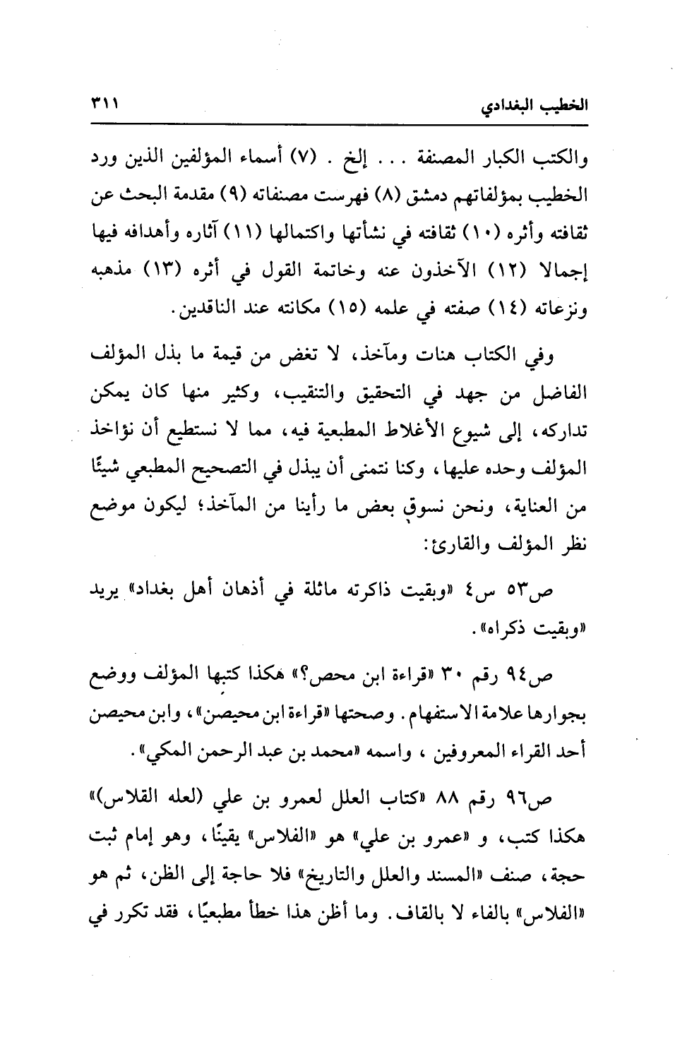 ص 96 رقم 88 "كتاب العلل لعمرو بن علي (لعله القلاس) " هكذا كتب، و"عمرو بن علي" هو "الفلاس" يقينًا، وهو إمام ثبت حجة، صنف "المسند والعلل والتاريخ" فلا حاجة إلى الظن، ثم هو "الفلاس" بالفاء لا بالقاف. وما أظن هذا خطأ مطبعيًا، فقد تكرر في