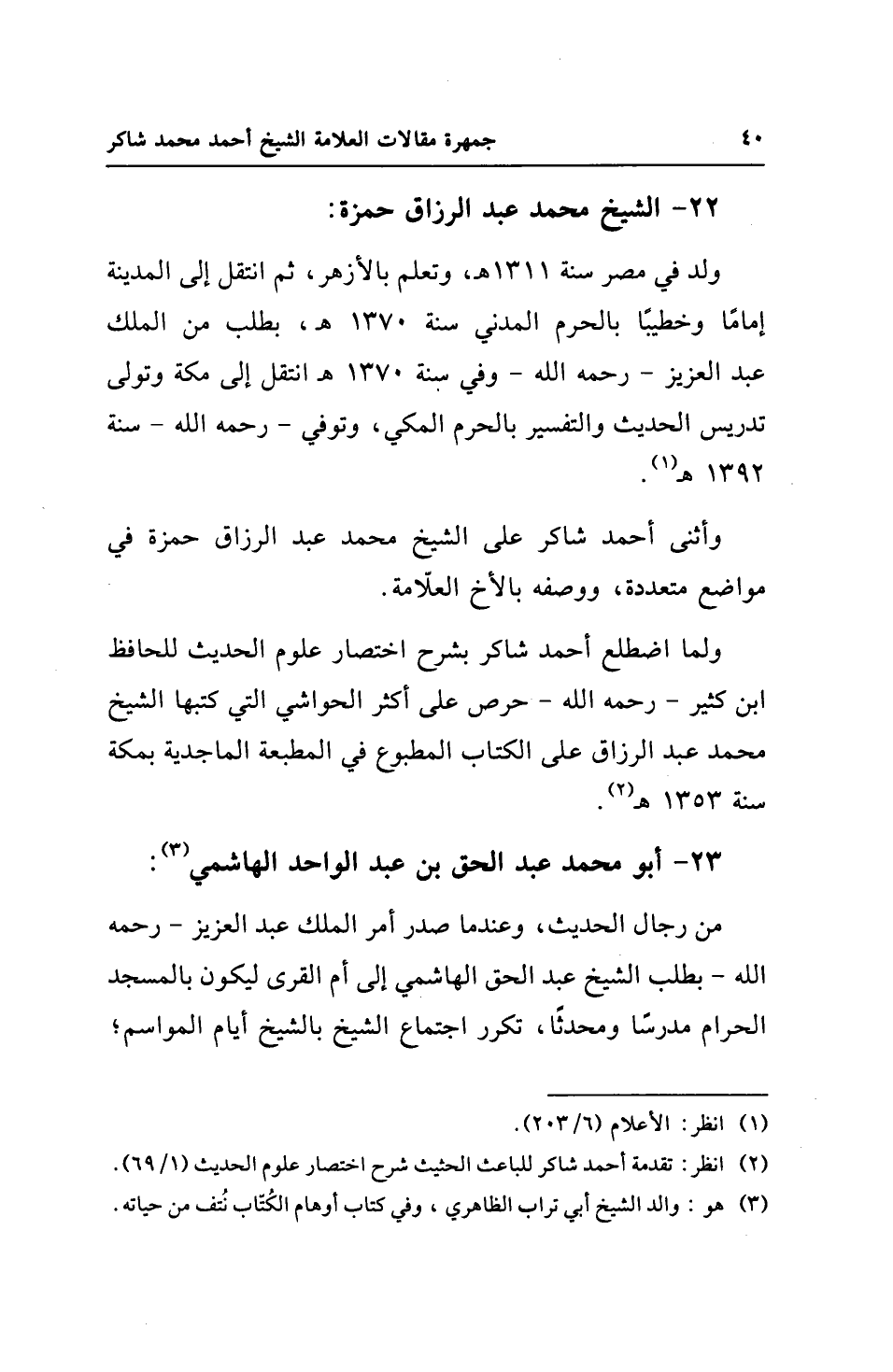 ولما اضطلع أحمد شاكر بشرح اختصار علوم الحديث للحافظ ابن كثير - رحمه الله - حرص على أكثر الحواشي التي كتبها الشيخ محمد عبد الرزاق على الكتاب المطبوع في المطبعة الماجدية بمكة سنة 1353 هـ (¬2).