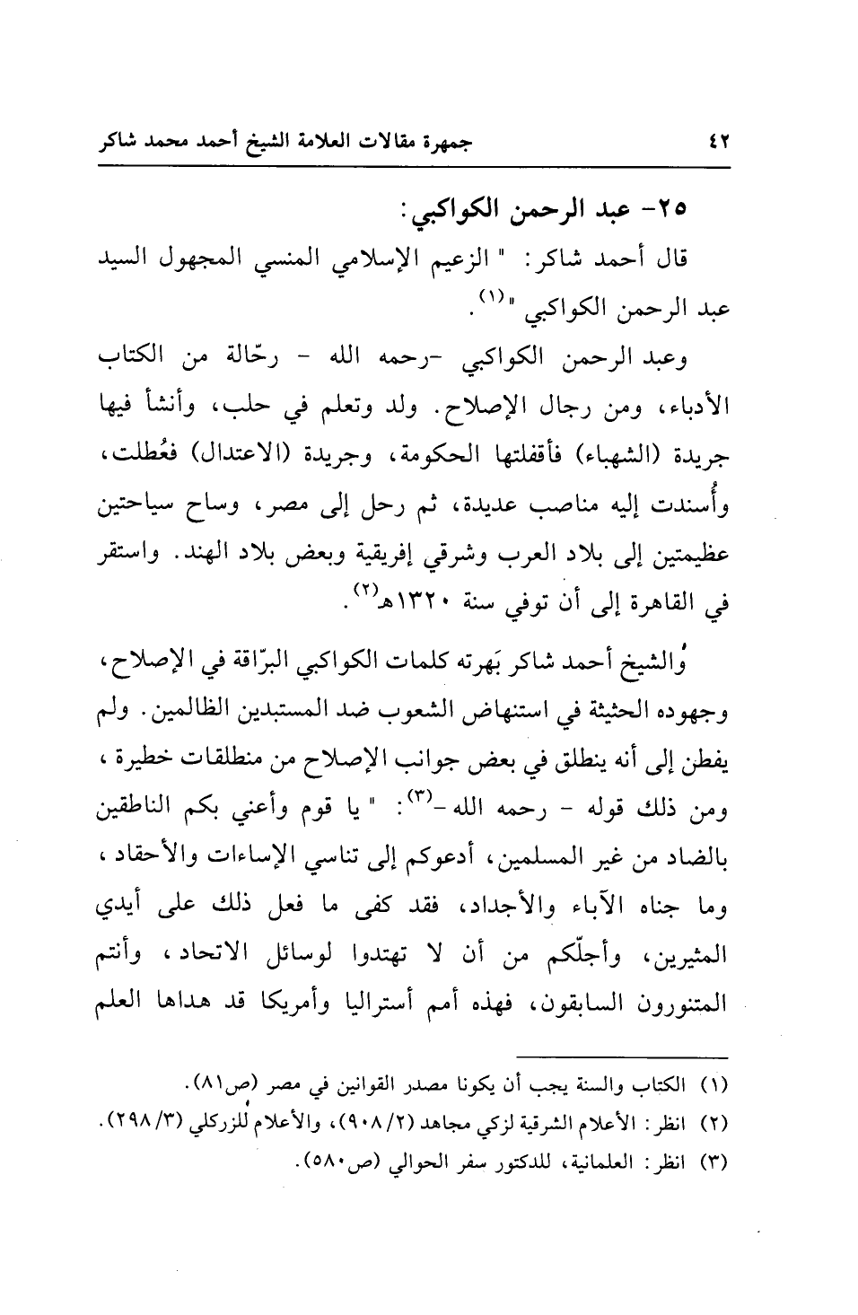 قال أحمد شاكر: "الزعيم الإسلامي المنسي المجهول السيد عبد الرحمن الكواكبي" (¬1).