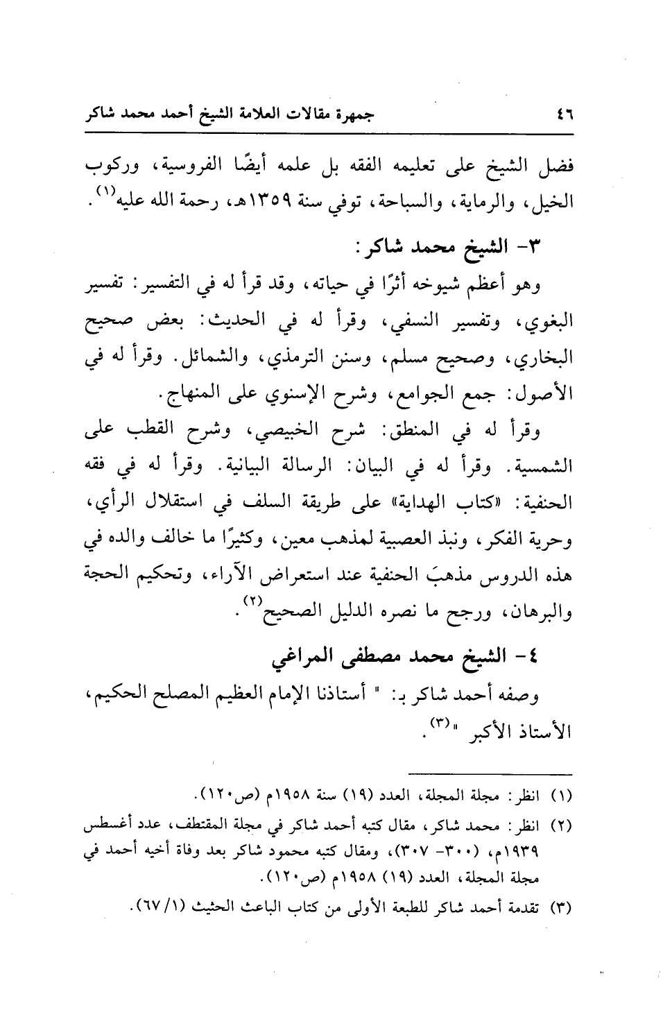(¬2) انظر: محمد شاكر، مقال كتبه أحمد شاكر في مجلة المقتطف، عدد أغسطس 1939 م، (300 - 307)، ومقال كتبه محمود شاكر بعد وفاة أخيه أحمد في مجلة المجلة، العدد (19) 1958 م (ص 120).