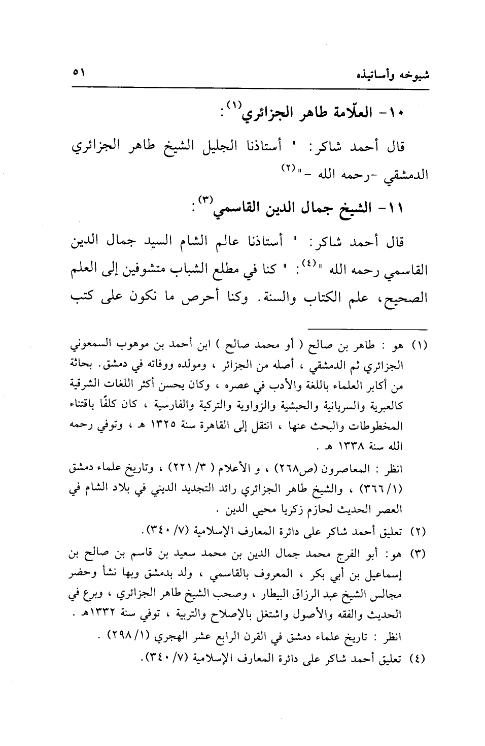 قال أحمد شاكر: "أستاذنا عالم الشام السيد جمال الدين القاسمي رحمه الله" (¬4): "كنا في مطلع الشباب متشوفين إلى العلم الصحيح، علم الكتاب والسنة. وكنا أحرص ما نكون على كتب