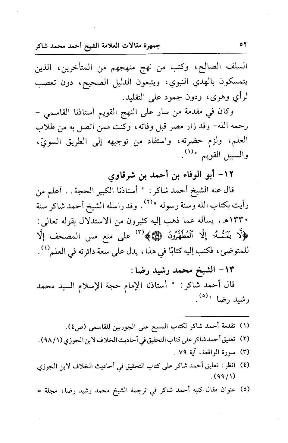 (¬1) تقدمة أحمد شاكر لكتاب المسح على الجوربين للقاسمي (ص 4).