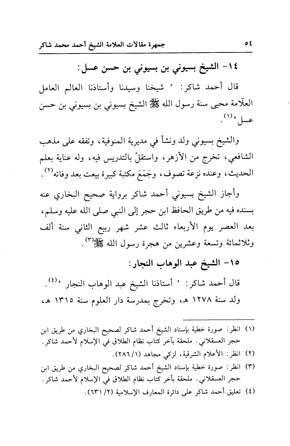 قال أحمد شاكر: "أستاذنا الشيخ عبد الوهاب النجار" (¬4).