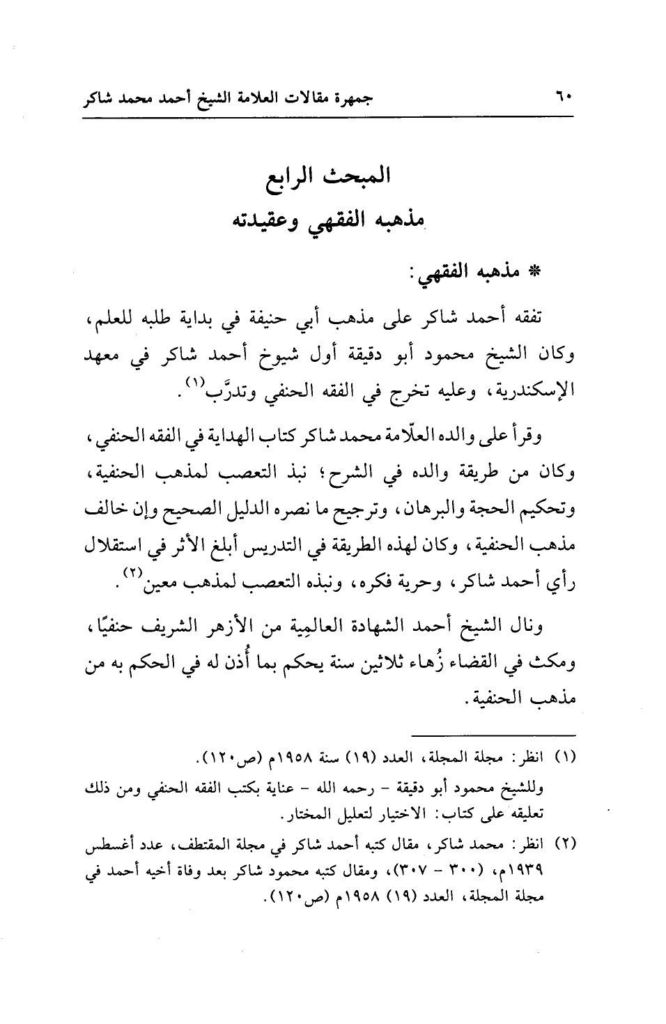 (¬2) انظر: محمد شاكر، مقال كتبه أحمد شاكر في مجلة المقتطف، عدد أغسطس 1939 م، (300 - 307)، ومقال كتبه محمود شاكر بعد وفاة أخيه أحمد في مجلة المجلة، العدد (19) 1958 م (ص 120).