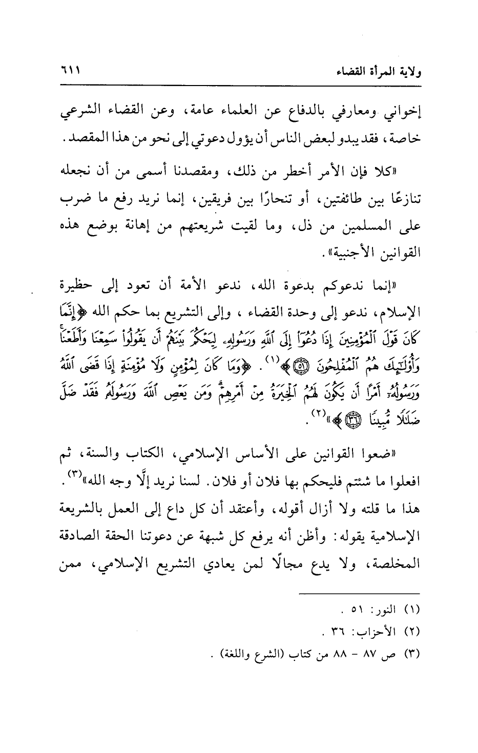 "إنما ندعوكم بدعوة الله، ندعو الأمة أن تعود إلى حظيرة الإسلام، ندعو إلى وحدة القضاء، وإلى التشريع بما حكم الله {إِنَّمَا كَانَ قَوْلَ الْمُؤْمِنِينَ إِذَا دُعُوا إِلَى اللَّهِ وَرَسُولِهِ لِيَحْكُمَ بَيْنَهُمْ أَنْ يَقُولُوا سَمِعْنَا وَأَطَعْنَا وَأُولَئِكَ هُمُ الْمُفْلِحُونَ (51)} (¬1). {وَمَا كَانَ لِمُؤْمِنٍ وَلَا مُؤْمِنَةٍ إِذَا قَضَى اللَّهُ وَرَسُولُهُ أَمْرًا أَنْ يَكُونَ لَهُمُ الْخِيَرَةُ مِنْ أَمْرِهِمْ وَمَنْ يَعْصِ اللَّهَ وَرَسُولَهُ فَقَدْ ضَلَّ ضَلَالًا مُبِينًا (36)} (¬2).
