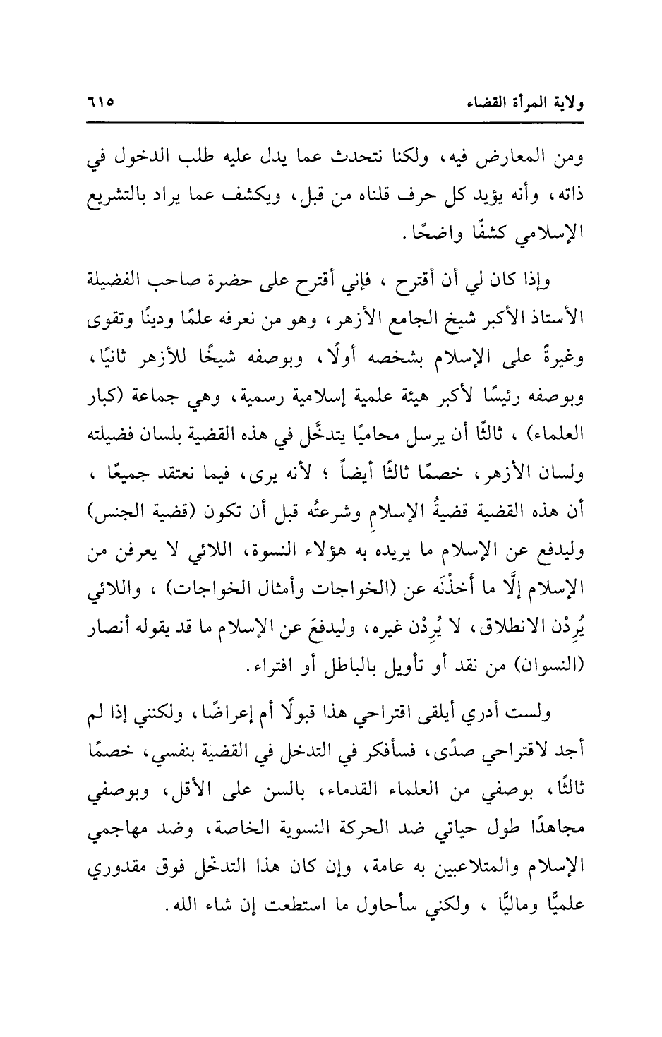 ولست أدري أيلقى اقتراحي هذا قبولًا أم إعراضًا، ولكنني إذا لم أجد لاقتراحي صدًى، فسأفكر في التدخل في القضية بنفسي، خصمًا ثالثًا، بوصفي من العلماء القدماء، بالسن على الأقل، وبوصفي مجاهدًا طول حياتي ضد الحركة النسوية الخاصة، وضد مهاجمي الإسلام والمتلاعبين به عامة، وإن كان هذا التدخّل فوق مقدوري علميًّا وماليًّا، ولكني سأحاول ما استطعت إن شاء الله.