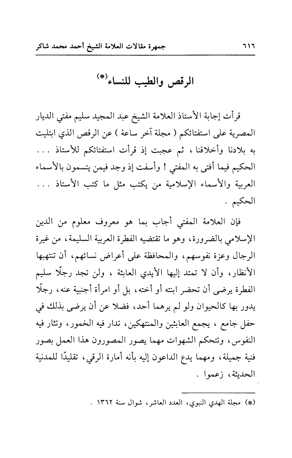 قرأت إجابة الأستاذ العلامة الشيخ عبد المجيد سليم مفتي الديار المصرية على استفتائكم (مجلة آخر ساعة) عن الرقص الذي ابتليت به بلادنا وأخلاقنا، ثم عجبت إذ قرأت استفتائكم للأستاذ ... الحكيم فيما أفتى به المفتي! وأسفت إذ وجد فيمن يتسمون بالأسماء العربية والأسماء الإسلامية من يكتب مثل ما كتب الأستاذ ... الحكيم.