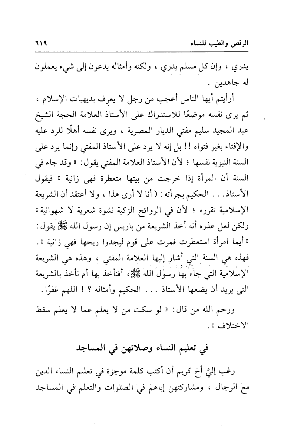 أرأيتم أيها الناس أعجب من رجل لا يعرف بديهيات الإسلام، ثم يرى نفسه موضعًا للاستدراك على الأستاذ العلامة الحجة الشيخ عبد المجيد سليم مفتي الديار المصرية، ويرى نفسه أهلًا للرد عليه والإفتاء بغير فتواه! ! بل إنه لا يرد على الأستاذ المفتي وإنما يرد على السنة النبوية نفسها؛ لأن الأستاذ العلامة المفتي يقول: "وقد جاء في السنة أن المرأة إذا خرجت من بيتها متعطرة فهى زانية" فيقول الأستاذ ... الحكيم بجرأته: (أنا لا أرى هذا، ولا أعتقد أن الشريعة الإسلامية تقرره؛ لأن في الروائح الزكية نشوة شعرية لا شهوانية) ولكن لعل عذره أنه أخذ الشريعة من باريس إن رسول الله - صلى الله عليه وسلم - يقول: "أيما امرأة استعطرت فمرت على قوم ليجدوا ريحها فهي زانية". فهذه هي السنة التي أشار إليها العلامة المفتي، وهذه هي الشريعة الإسلامية التي جاء بها رسول الله - صلى الله عليه وسلم -، أفنأخذ بها أم نأخذ بالشريعة التى يريد أن يضعها الأستاذ ... الحكيم وأمثاله؟ ! اللهم غفرًا.