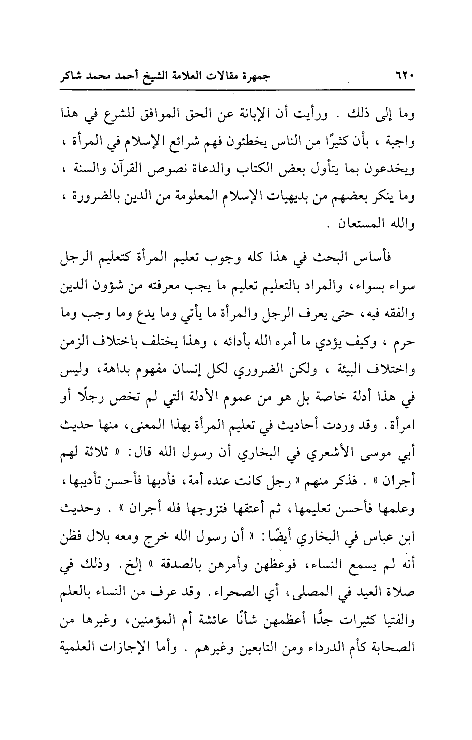 فأساس البحث في هذا كله وجوب تعليم المرأة كتعليم الرجل سواء بسواء، والمراد بالتعليم تعليم ما يجب معرفته من شؤون الدين والفقه فيه، حتى يعرف الرجل والمرأة ما يأتي وما يدع وما وجب وما حرم، وكيف يؤدي ما أمره الله بأدائه، وهذا يختلف باختلاف الزمن واختلاف البيئة، ولكن الضروري لكل إنسان مفهوم بداهة، وليس في هذا أدلة خاصة بل هو من عموم الأدلة التي لم تخص رجلًا أو امرأة. وقد وردت أحاديث في تعليم المرأة بهذا المعنى، منها حديث أبي موسى الأشعري في البخاري أن رسول الله قال: "ثلاثة لهم أجران". فذكر منهم "رجل كانت عنده أمة، فأدبها فأحسن تأديبها، وعلمها فأحسن تعليمها، ثم أعتقها فتزوجها فله أجران". وحديث ابن عباس في البخاري أيضًا: "أن رسول الله خرج ومعه بلال فظن أنه لم يسمع النساء، فوعظهن وأمرهن بالصدقة" إلخ. وذلك في صلاة العيد في المصلى أي الصحراء. وقد عرف من النساء بالعلم والفتيا كثيرات جدًّا أعظمهن شأنًا عائشة أم المؤمنين، وغيرها من الصحابة كأم الدرداء ومن التابعين وغيرهم. وأما الإجازات العلمية