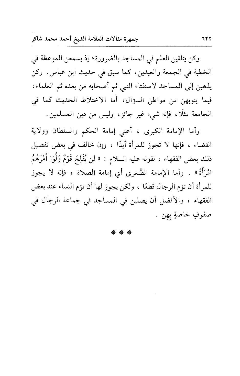وأما الإمامة الكبرى، أعني إمامة الحكم والسلطان وولاية القضاء، فإنها لا تجوز للمرأة أبدًا، وإن خالف في بعض تفصيل ذلك بعض الفقهاء، لقوله عليه السلام: "لن يُفْلِحَ قَوْمٌ وَلَّوْا أَمْرَهُمُ امْرَأَةً". وأما الإمامة الصُّغرى أي إمامة الصلاة، فإنه لا يجوز للمرأة أن تؤم الرجال قطعًا، ولكن يجوز لها أن تؤم النساء عند بعض الفقهاء، والأفضل أن يصلين في المساجد في جماعة الرجال في صفوفٍ خاصةٍ بِهِن.